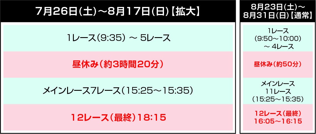 7月26日(土)~8月17日(日)の第3回中京競馬では、暑熱対策として、気温が特に高くなる時間帯を避けて競馬開催を実施します。これに伴い、発走時刻や、お昼の休憩時間が通常の開催とは異なり、メインレースは第11レースから第7レースに変更となりますのでご注意ください。