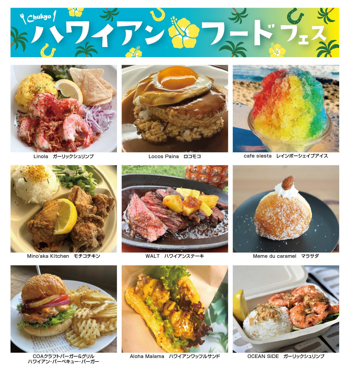 8月23日(土)から31日(日)はグルメイベント「ハワイアンフードフェス」を開催。地元でも人気のハワイアンフードが中京競馬場に集結します。アロハな気分で、南国グルメを満喫しよう!