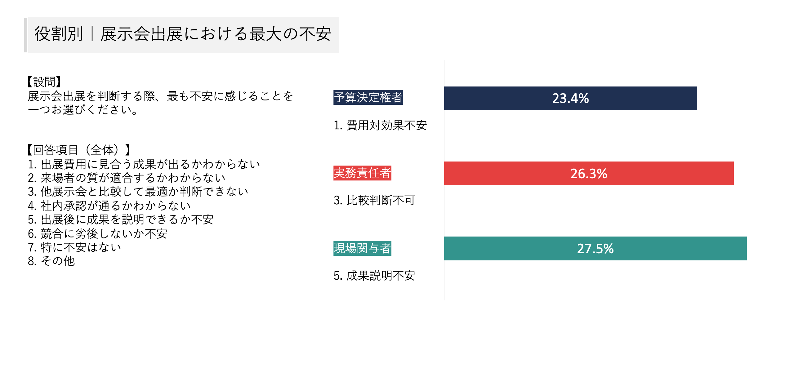 本調査では、回答者の立場別に分析を行った結果、展示会出展における不安の中身は役割によって大きく異なることが明らかになりました。