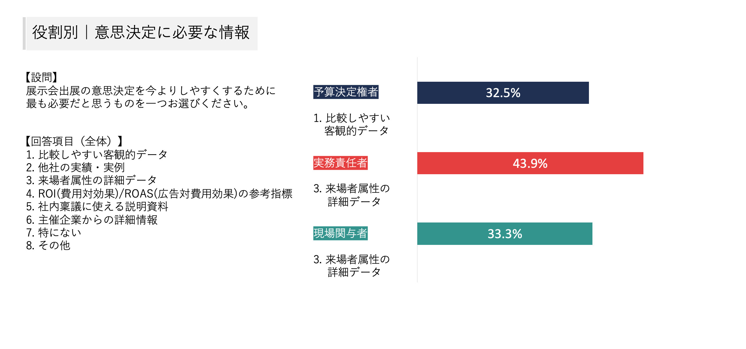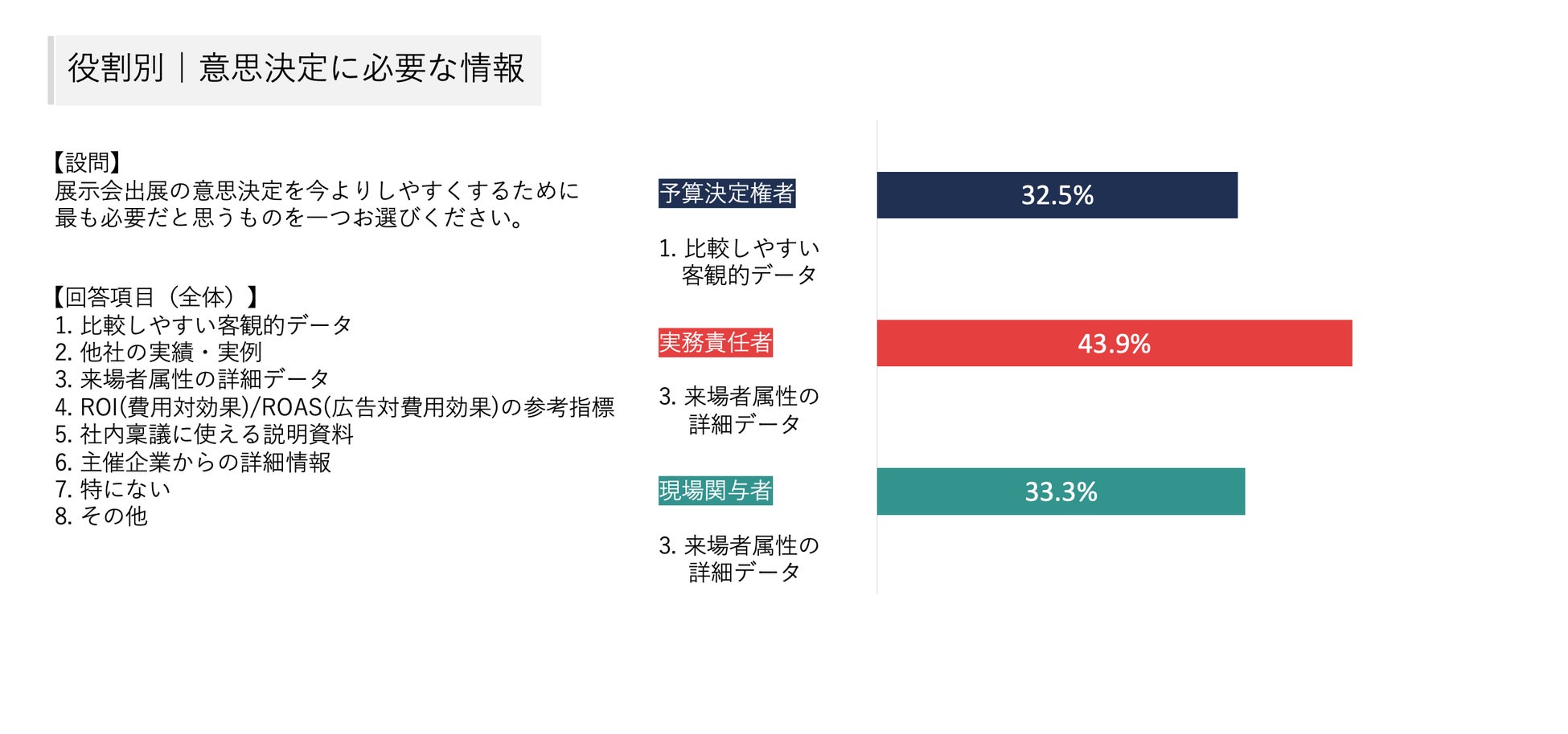 また、予算決定権者では「比較しやすい客観的データ」(32.5%)、実務責任者では「来場者属性の詳細データ」(43.9%)、現場関与層では「ROI/ROASの参考指標」(24.2%)がそれぞれ上位となりました。