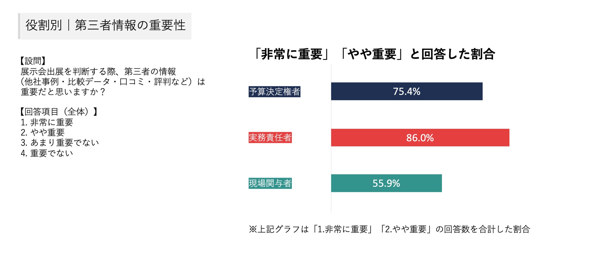 第三者情報の重要性については、予算決定権者の75.4%、展示会運営の実務責任者の86.0%が「重要」「やや重要」と回答しました。