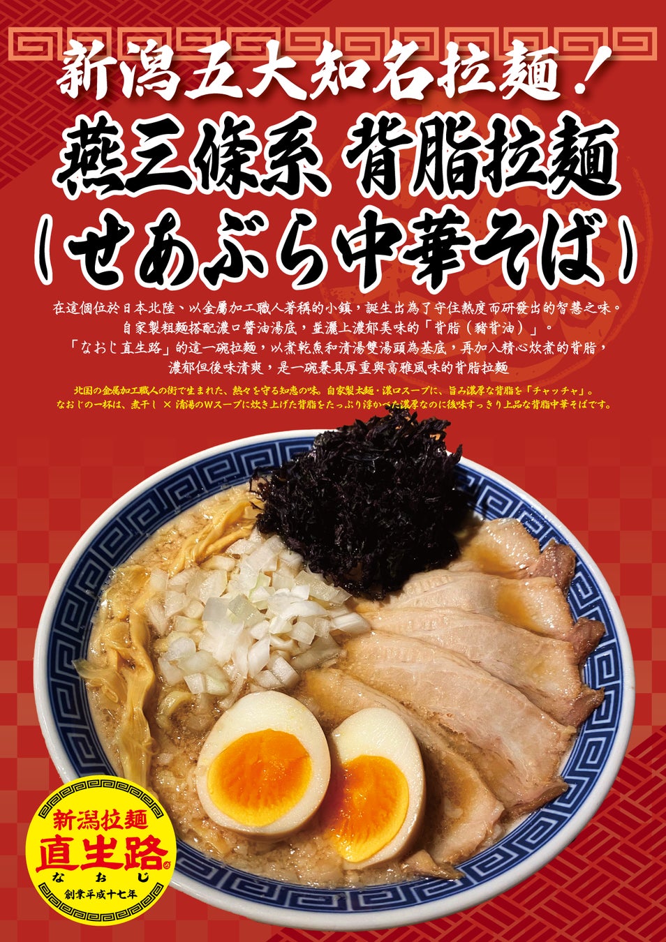 「なおじ」は、新潟ご当地ラーメンの魅力を守りながら、進化を重ねてきたブランドです。看板メニューの「背脂中華そば」をはじめ、日本の味をそのままに、台湾のお客様にも本格的な新潟ラーメンをご提供いたします。
