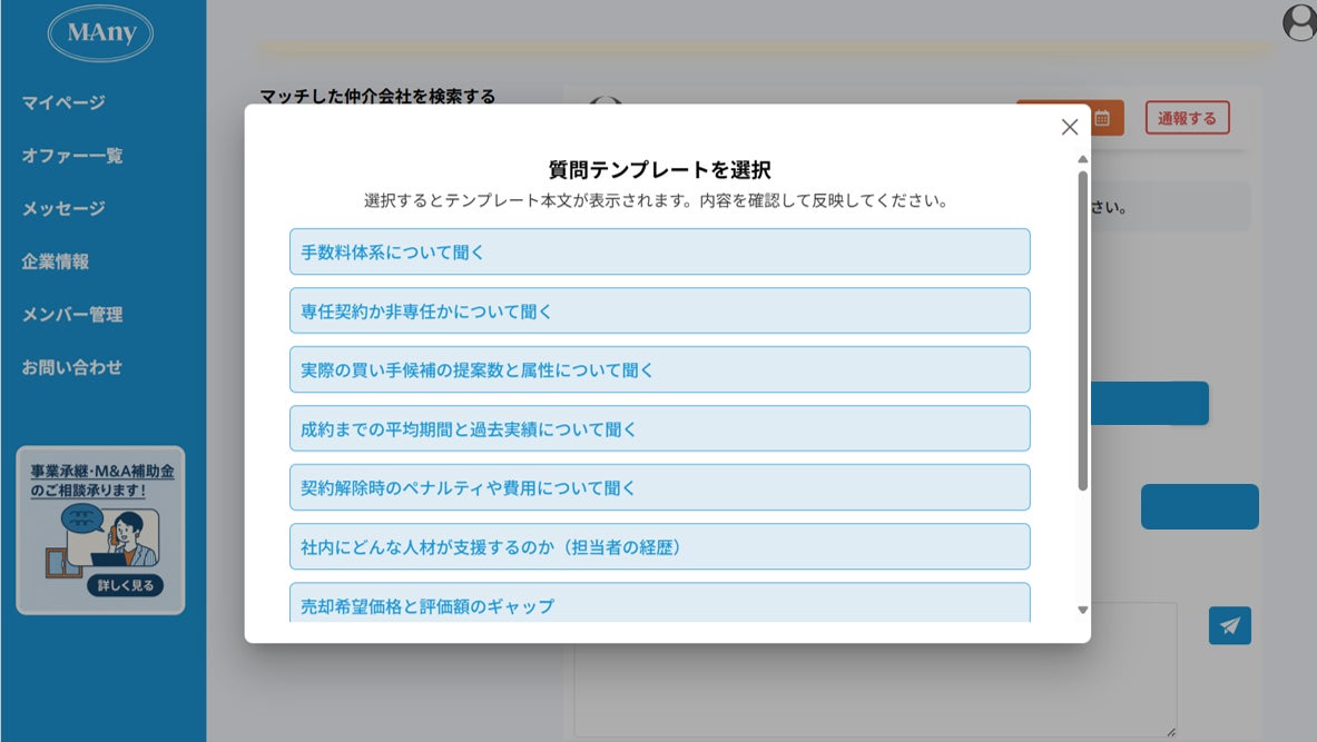 M&Aを検討中の企業が投稿を作成する際、選ぶだけで記載できる質問テンプレート(例:「手数料について」「契約形態について」など9種類)を用意。初めてでも“聞きたいこと”が自然に言語化できるようになります。
