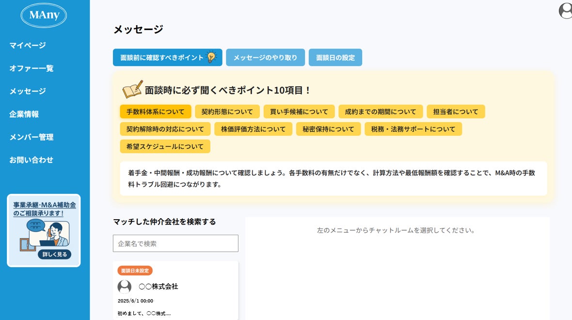 実際の面談時やチャットのやり取りの中で確認すべきポイント(手数料体系、契約解除条件、PMI支援の有無など)を10項目に整理し、マイページ上で閲覧可能に。トラブル防止や意思決定の質向上を支援します。