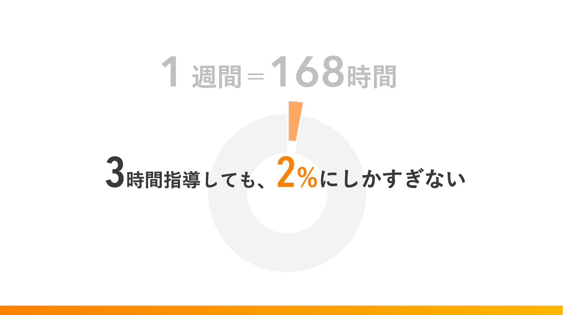 毎週3時間丁寧に指導したとしても、生徒に関われる時間は、1週間のうちたった2%。本当に成果を出すためには「授業以外の時間」にも関わることが大変重要であると考えました。