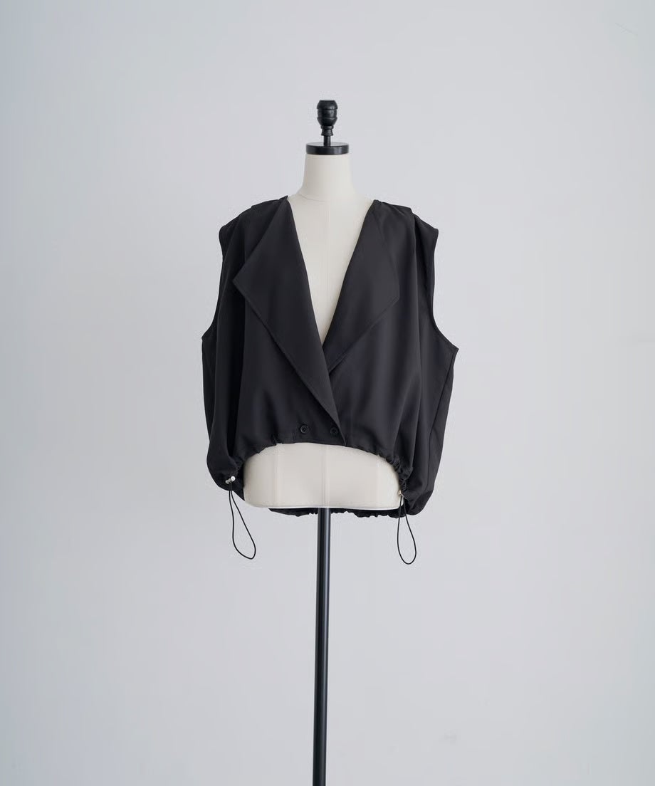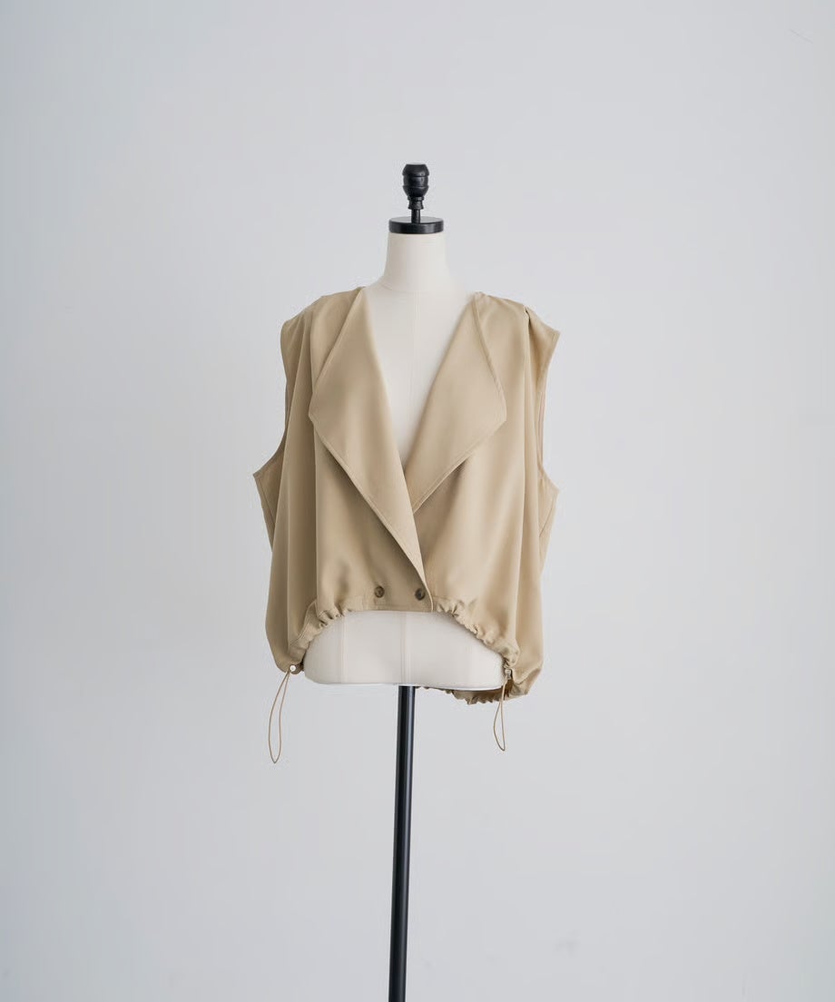 大きめにデザインされたラペルとフロントのボタンがアクセントのジレ。ベージュ、グレー、ブラックの3色展開。