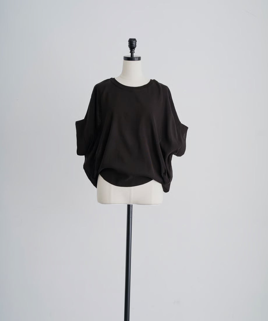 着丈に前後差があり、前はボトムにインしなくてもキマる絶妙な丈感が嬉しい。体のシルエットを拾わない上品なドルマンスリーブがポイント。