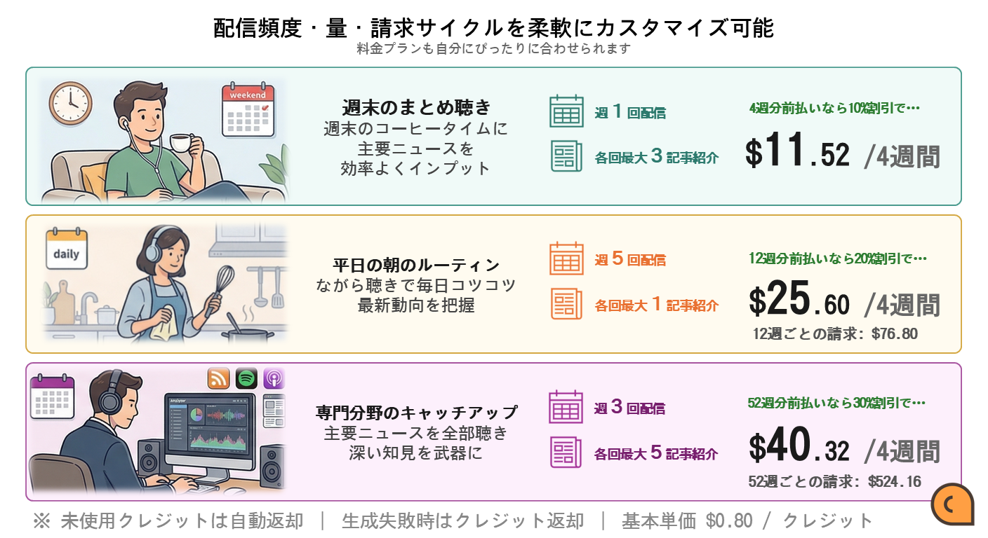 1エピソードあたり「基本コスト + 記事数」に応じて消費し、配信頻度や請求サイクルをカスタマイズできるフレキシブルな料金体系です。また、以下の設計によりユーザーリスクを最小化しています。