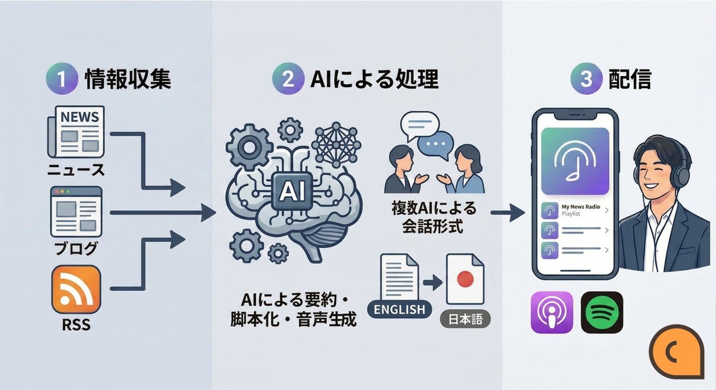ユーザーが選択したRSSソースをもとに、AIが内容を整理・再構成し、「自分のためだけ」の番組を生成いたします。英語のフィードを設定することにより、英語圏の最新情報を日本語で聴くことも可能です。