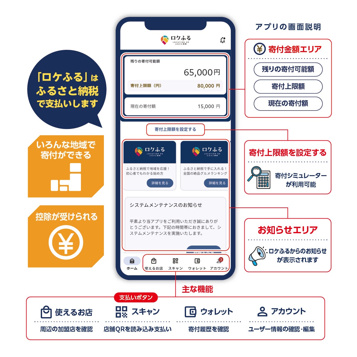 「ロケふる」は、App Store / Google Playからダウンロードできるスマートフォン専用アプリです。観光や通勤・出張、買い物等で倉敷市を訪れた方が、市内での飲食・買い物・体験等の支払いをそのまま寄付に変換でき、返礼品(商品・体験・サービス)を即時に受け取れる仕組みです。QRコードを用いた決済により、寄付と返礼品の受け取りが同時に完了するため、利便性が非常に高いサービスです。