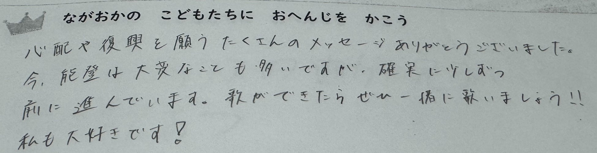 能登の子どもたちと約束をしました。「みんなと作った応援歌を、必ず、全国に広げていくからね!」と。