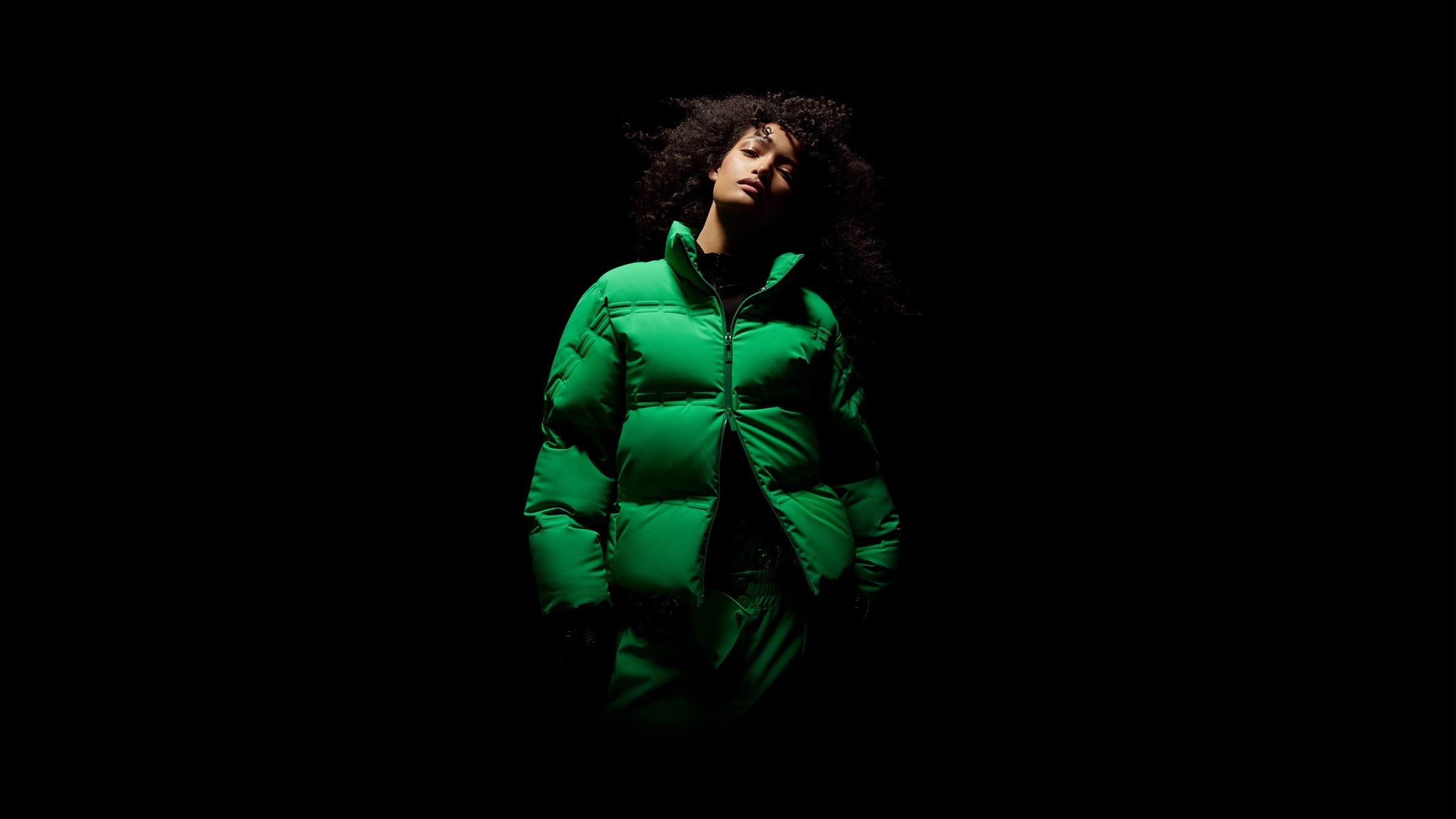 ヴィンテージスキーウェアから着想を得たコレクションは、ラバレッド、エレクトリックインディゴ、ブライトエメラルドの大胆なカラーブロッキングが、ブラックやホワイトのピースに映えます。