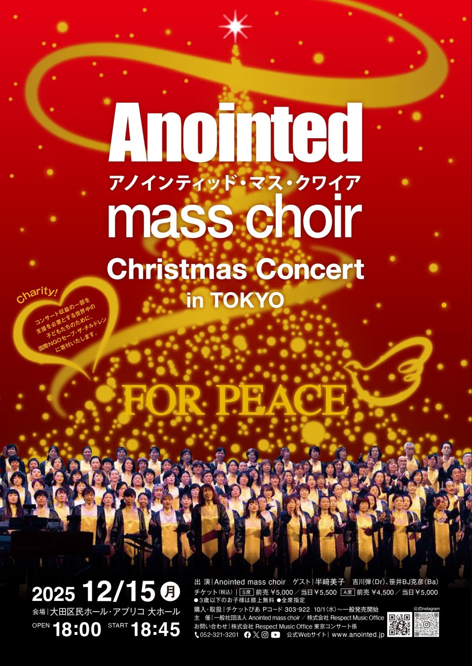 株式会社Respect Music Office(所在地:愛知県名古屋市、代表:田中学)は2025年12月15日(月)、大田区民ホール・アプリコ 大ホールにて、コンサート「Anointed mass choir Christmas Concert in TOKYO 『FOR PEACE』」を開催します。