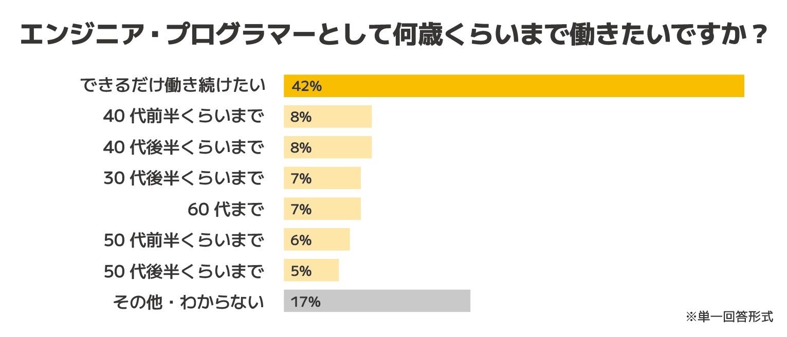 「エンジニア・プログラマーとして何歳くらいまで働きたいですか?」という設問(単一回答形式)では、最多は「できるだけ働き続けたい」(42%)でした。「プログラミングは年齢を問わず活躍できる分野であり、知識や経験を積み重ねるほどに仕事の幅も広がる」「年齢に関係なく、可能な限り長く現役として働きたい」といった声も寄せられ、知識蓄積型の専門職ならではの特性が表れていると考えられます。