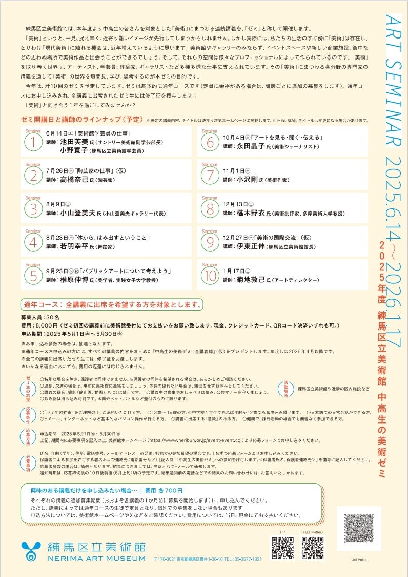 練馬区立美術館(東京都練馬区貫井)は、2025年6月から2026年1月にかけて中高生を対象にした「美術」に関連する連続講義を「中高生の美術ゼミ」と称して開催します。