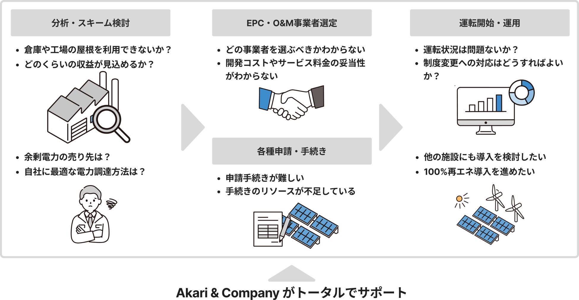 本サービスは、企業ごとの電力使用状況、施設条件、中長期目標などに応じて、最適な再エネ調達スキームと導入手段を設計・提案するものです。ご希望に応じて、導入手続き及び導入後のサポートまでをトータルで支援します。