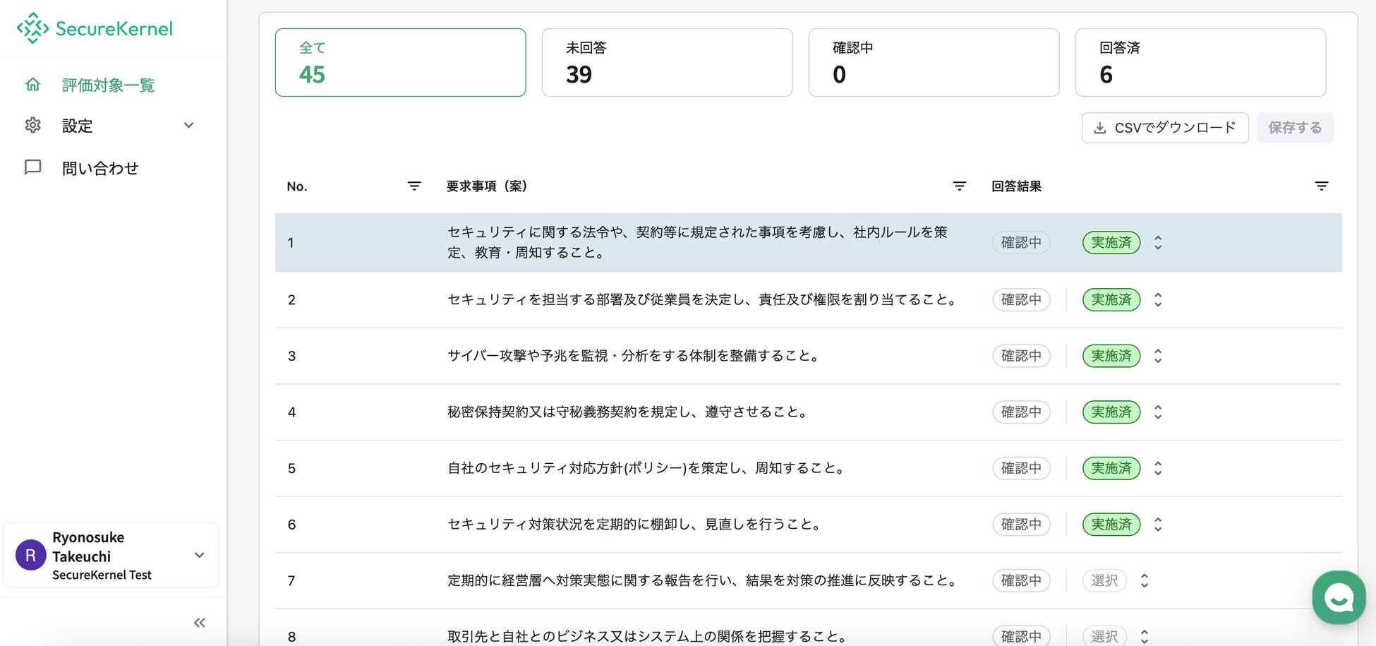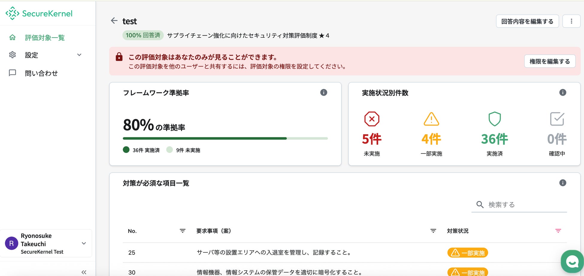 当社は「セキュリティの民主化を実現する」をビジョンに掲げ、国主導の評価制度の普及を後押しすべく、現時点で公開されている評価基準をSecureKernelに実装。中小企業から大企業まで、セキュリティ人材不足でも簡単にサプライチェーンセキュリティ対策の現状評価と可視化が可能な環境を整えました。