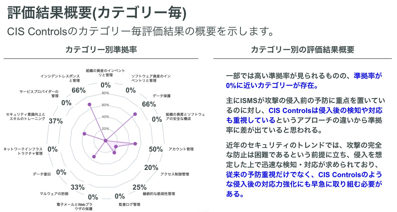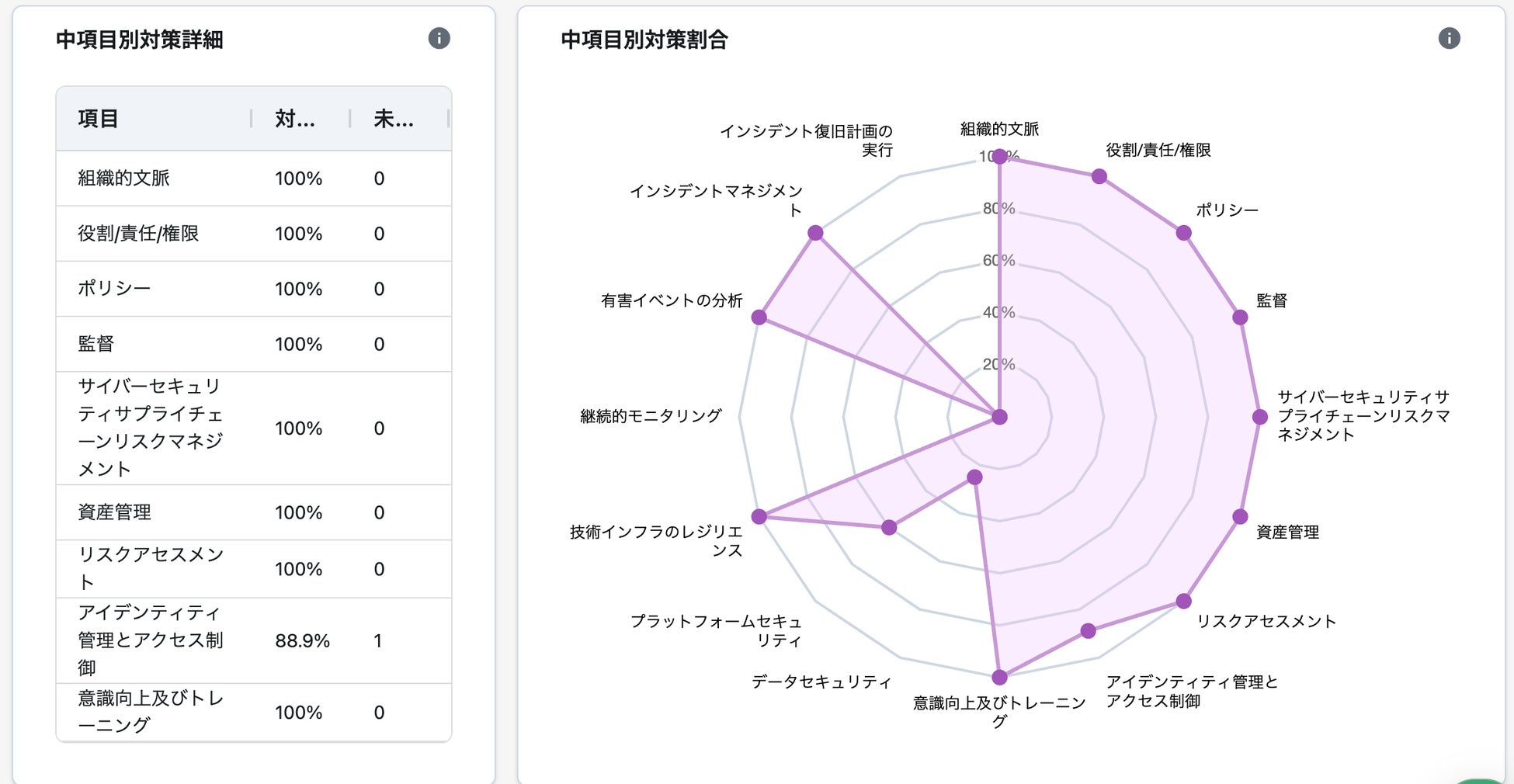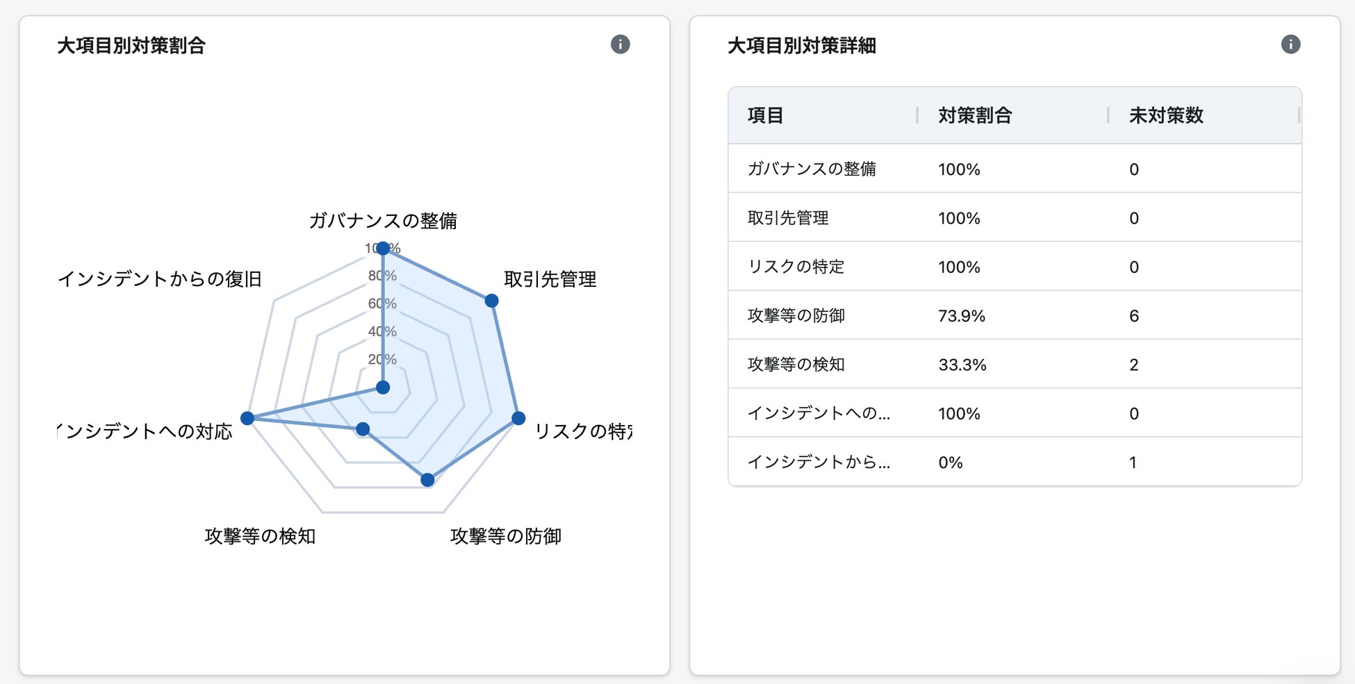 既存ユーザーは、NIST CSFやCIS Controlsなど当社が実装する各種フレームワークとのマッピング表を活用することで、短時間で自社の現状適合度を把握し、改善ポイントを明確にできます。