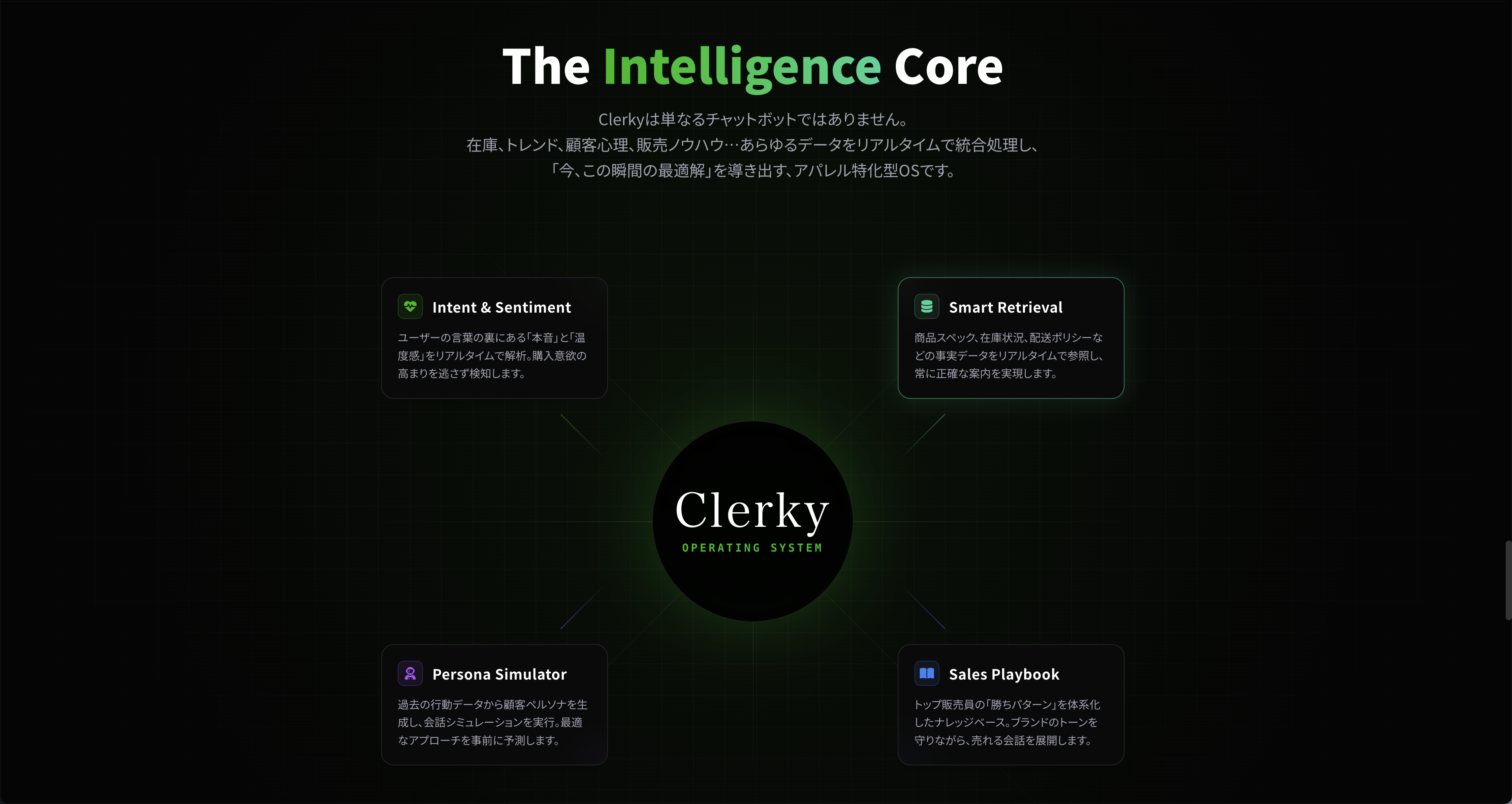 Clerkyは、文脈理解・感情分析・購買履歴・在庫情報・試着画像生成を統合し、「今、この瞬間の最適な一言」を導き出します。