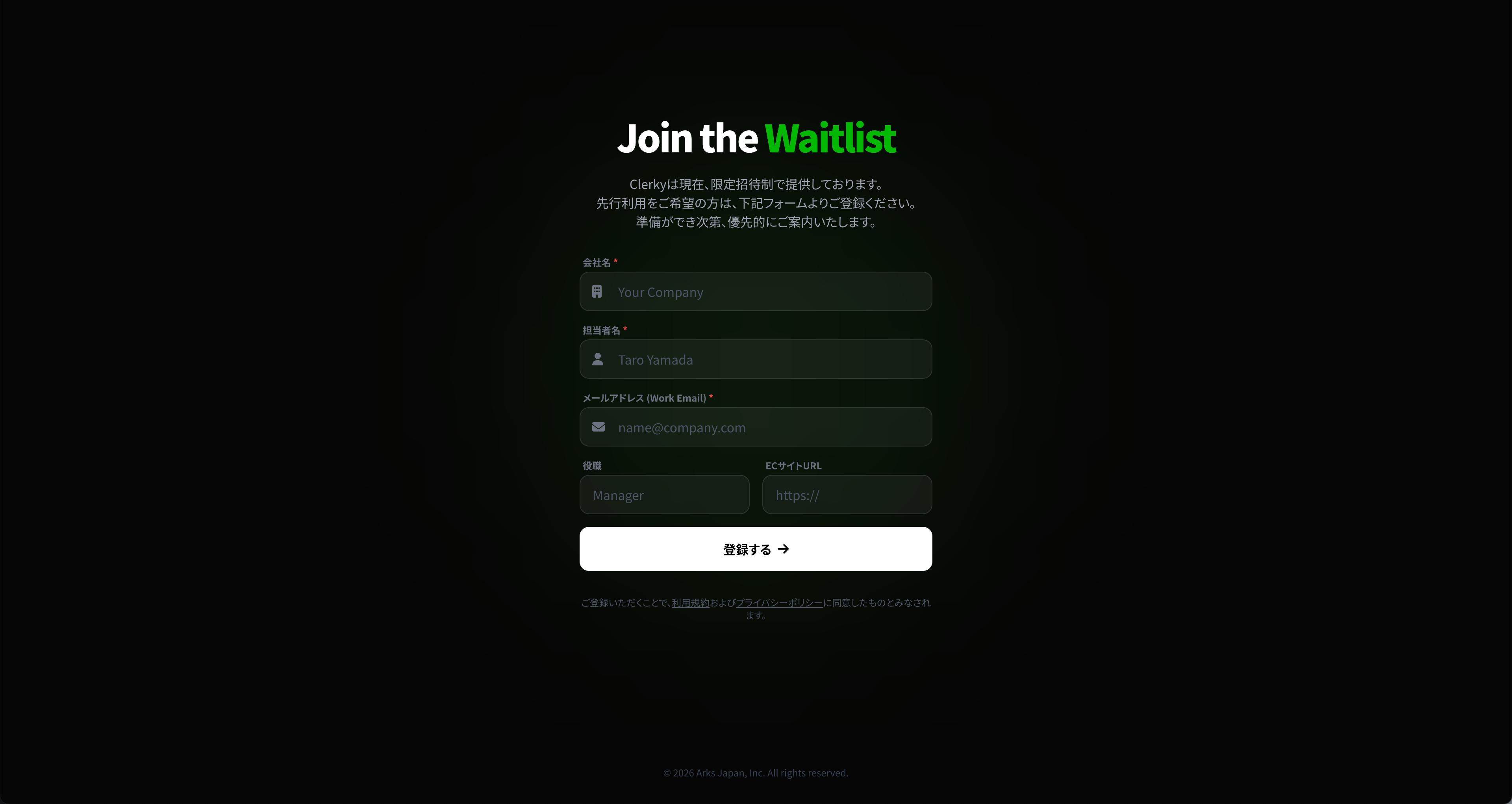 「Arks Japan株式会社」(所在地:東京都港区、代表取締役社長:坂本 翔吾)は、アパレルECに特化したAI接客プラットフォーム 「Clerky for Apparel」 のβ版Waitlistを公開しました。