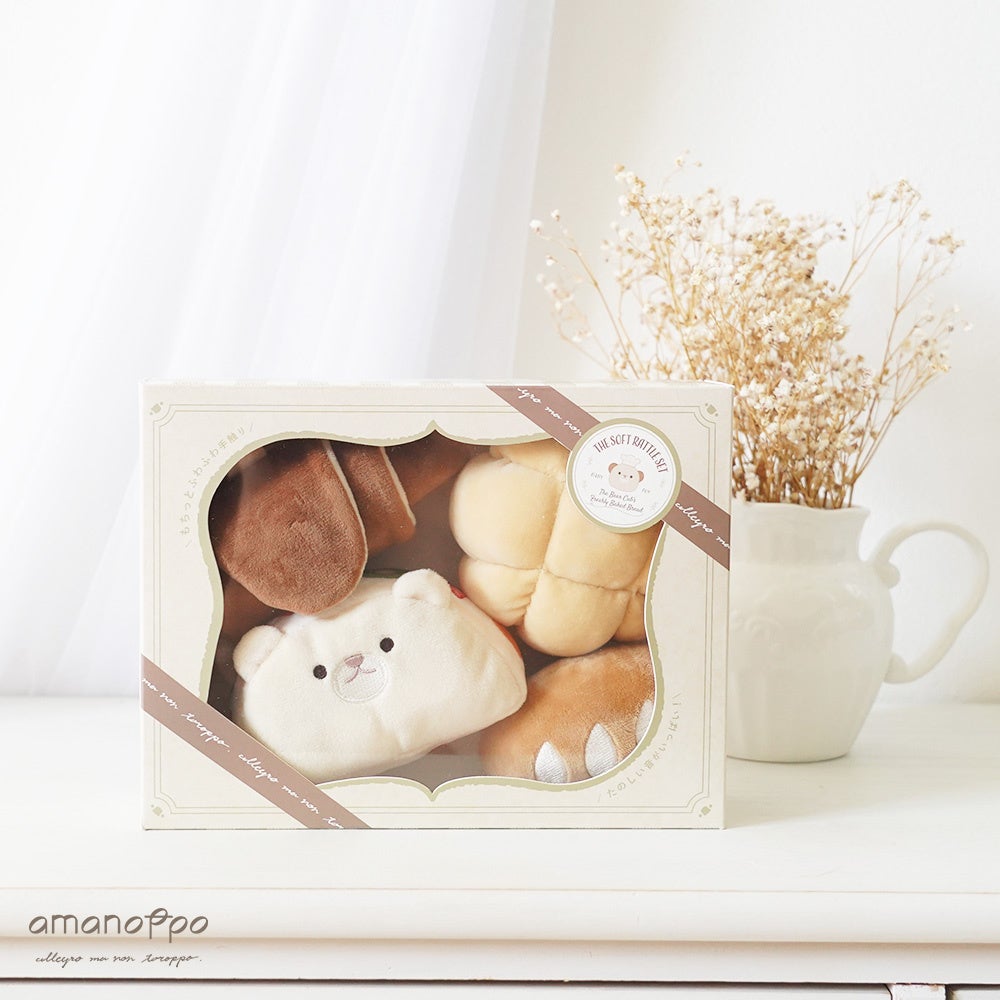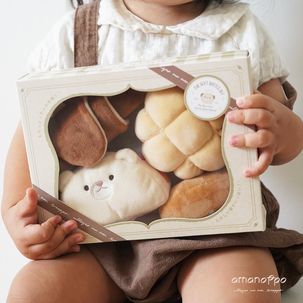 ふんわりやさしい世界観が人気の「cocory friends」シリーズから生まれた新作で、絵本『こぐまくんの焼きたてパン』の世界をそのまま再現した、パンモチーフの布ラトルセットです。
