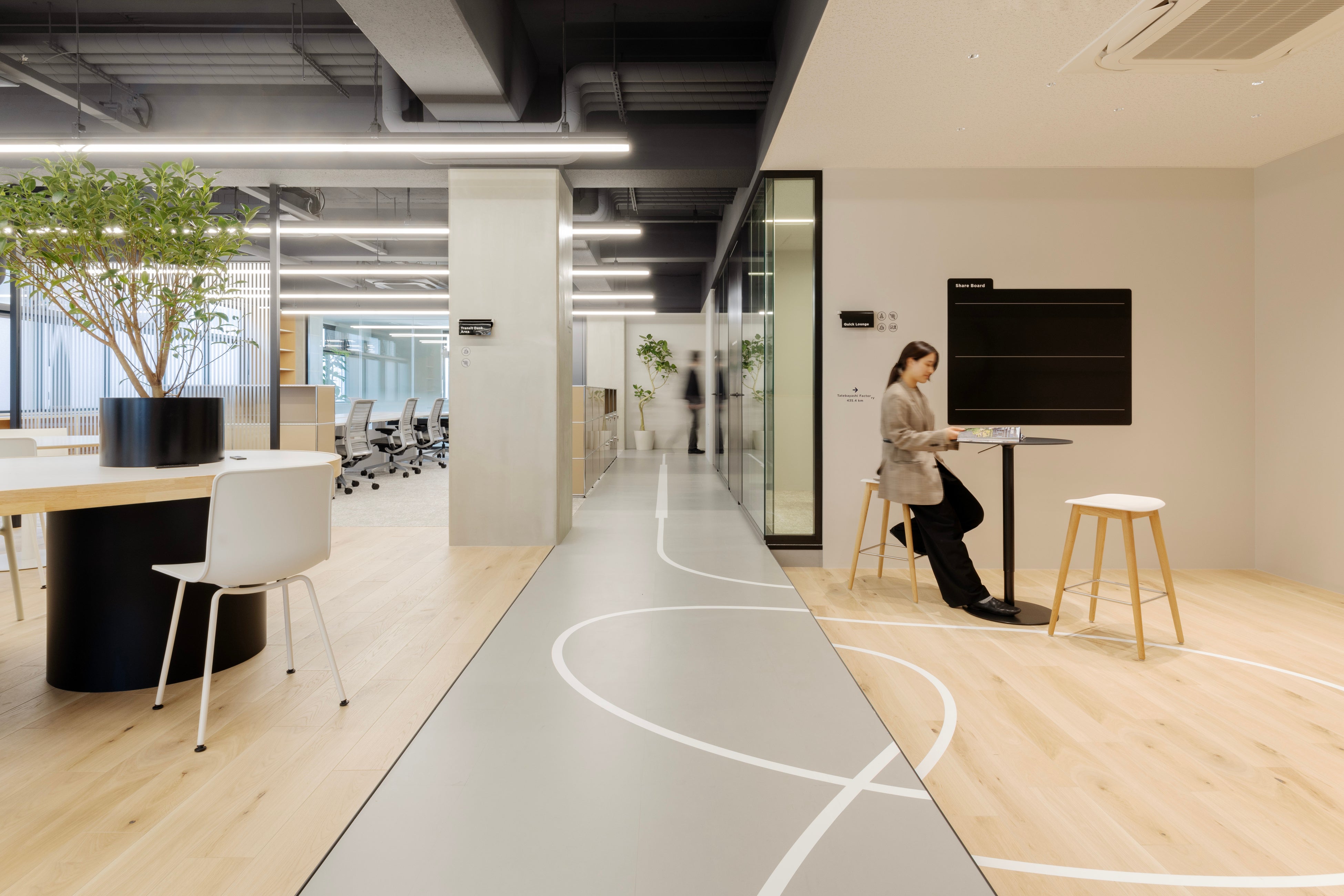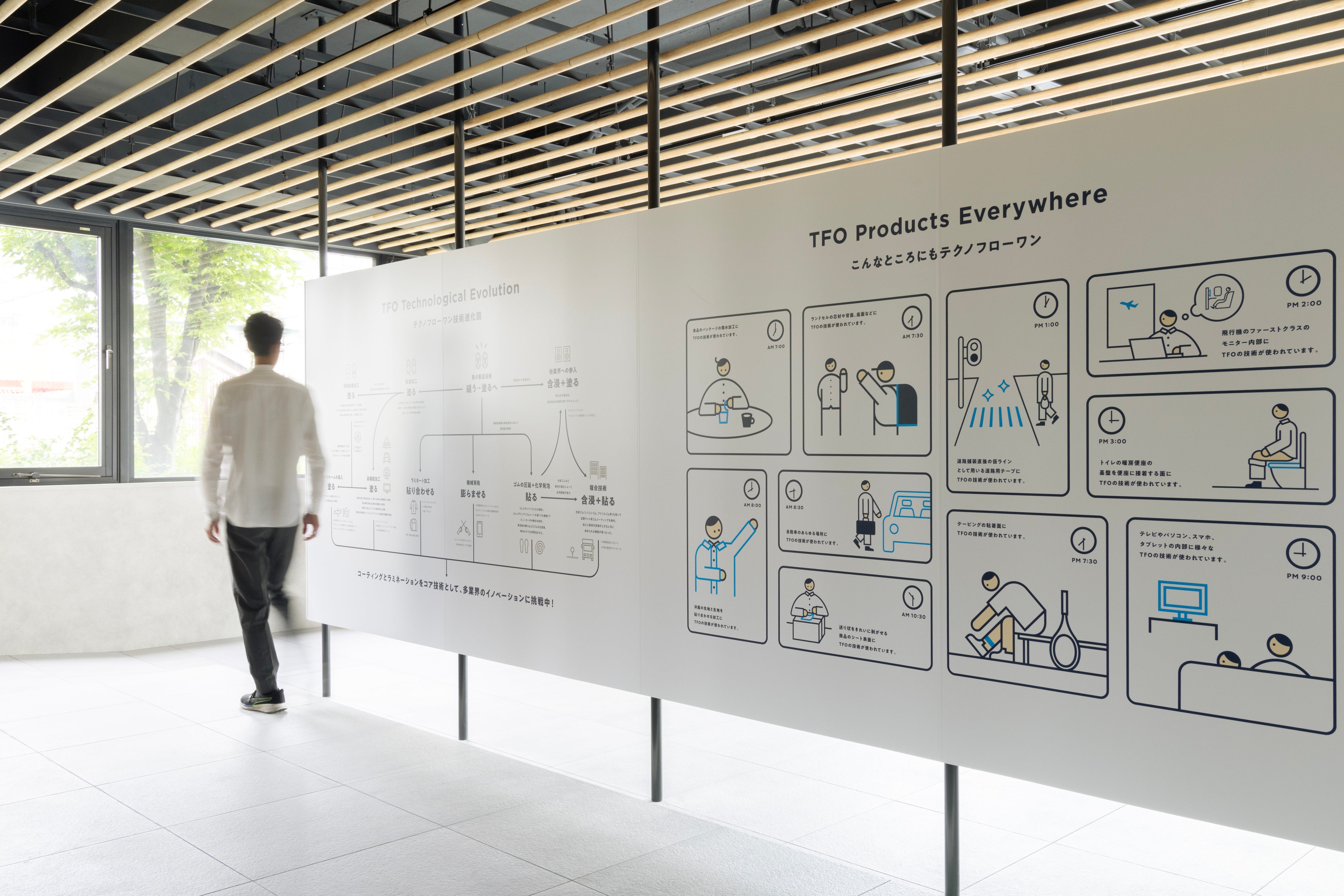 同社の創業時のルーツである「履物縫製」から着想を得て、オフィスワーカーの「足元」に着目。歩幅を合わせたりステップを踏みたくなるような「床のグラフィック」を施すことで、日常の移動を運動やコミュニケーションのきっかけへと変換しています。
