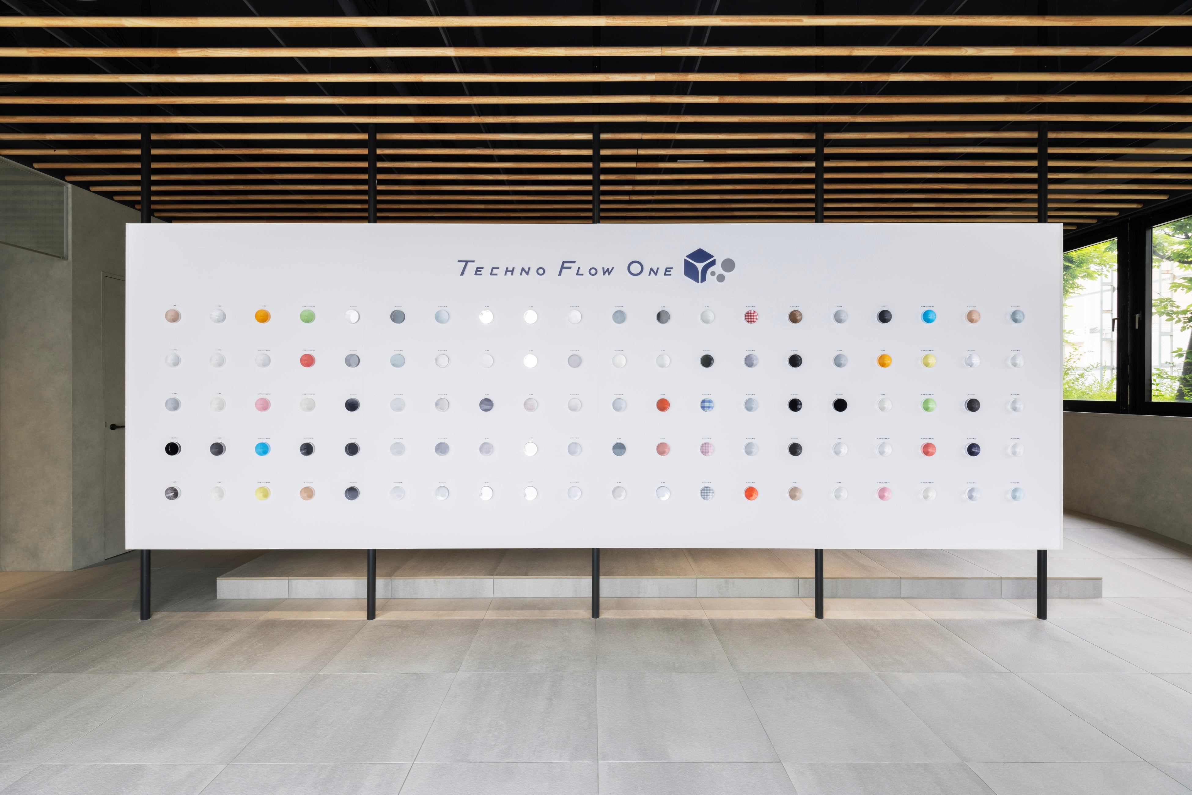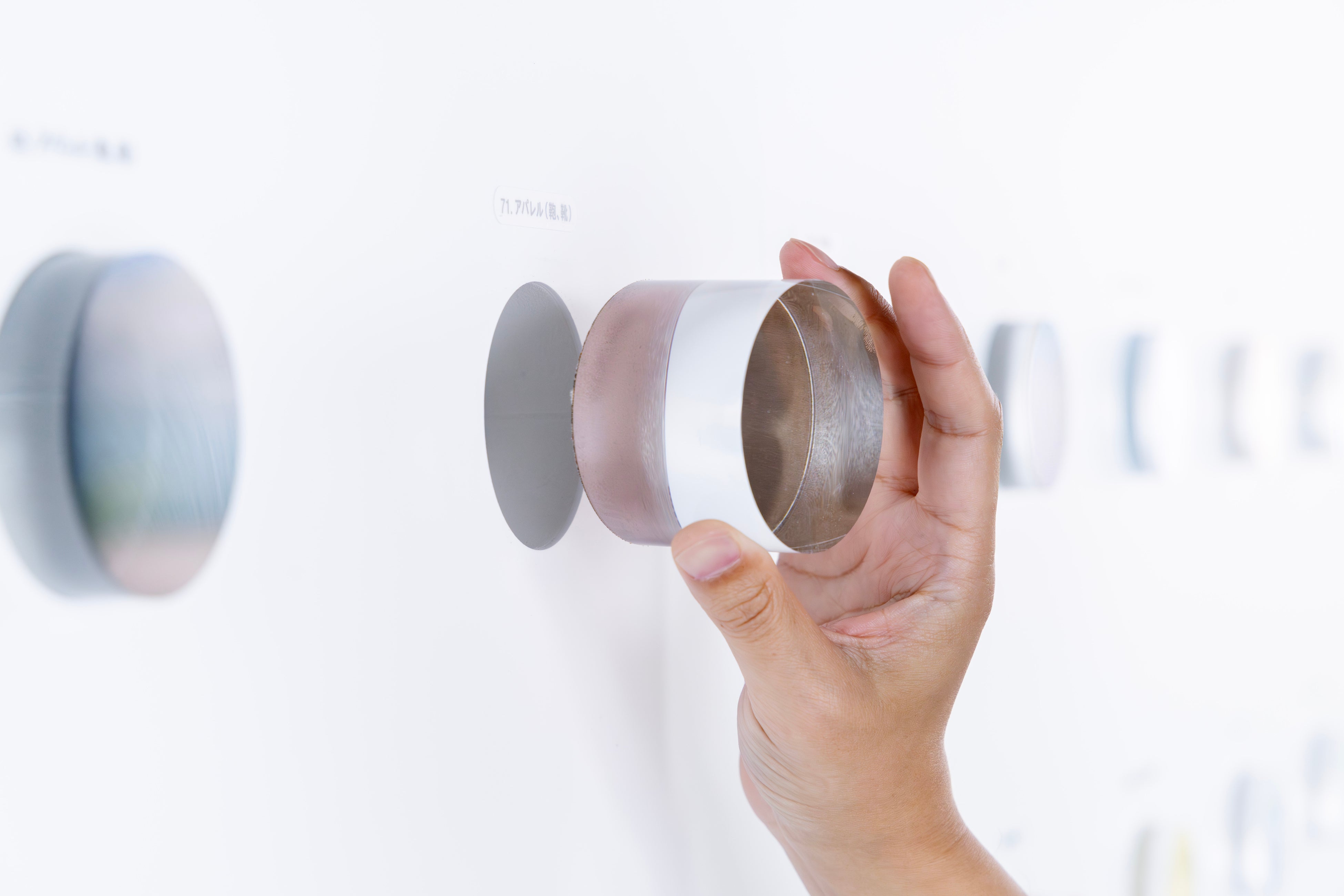 本来は見えにくい工業技術(粘着やコーティングなど)を、アクリルブロックに封入して可視化。100種類の加工サンプルをギャラリーのように展示することで、オフィスを単なる働く場所から「生きた実験場」へと昇華させました。