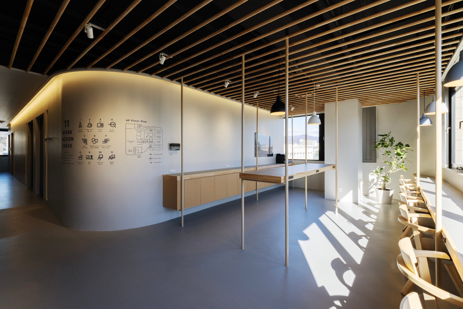 従業員への徹底したインサイト調査(Deep Insight)に基づき、集中とリフレッシュのメリハリをつける空間、組織のサイロ化を打破するコミュニケーション・顧客との共創を生む技術ギャラリーなど、独自の「11のワークデザインアイデア」を空間に実装しています。