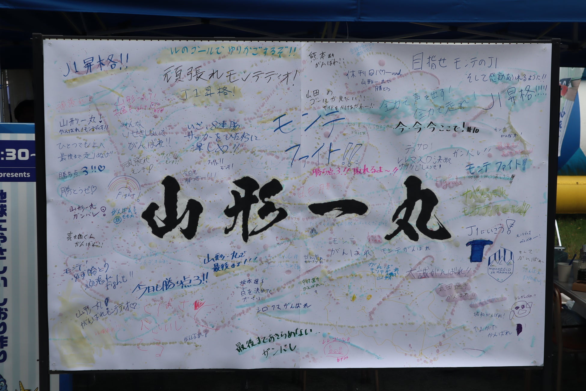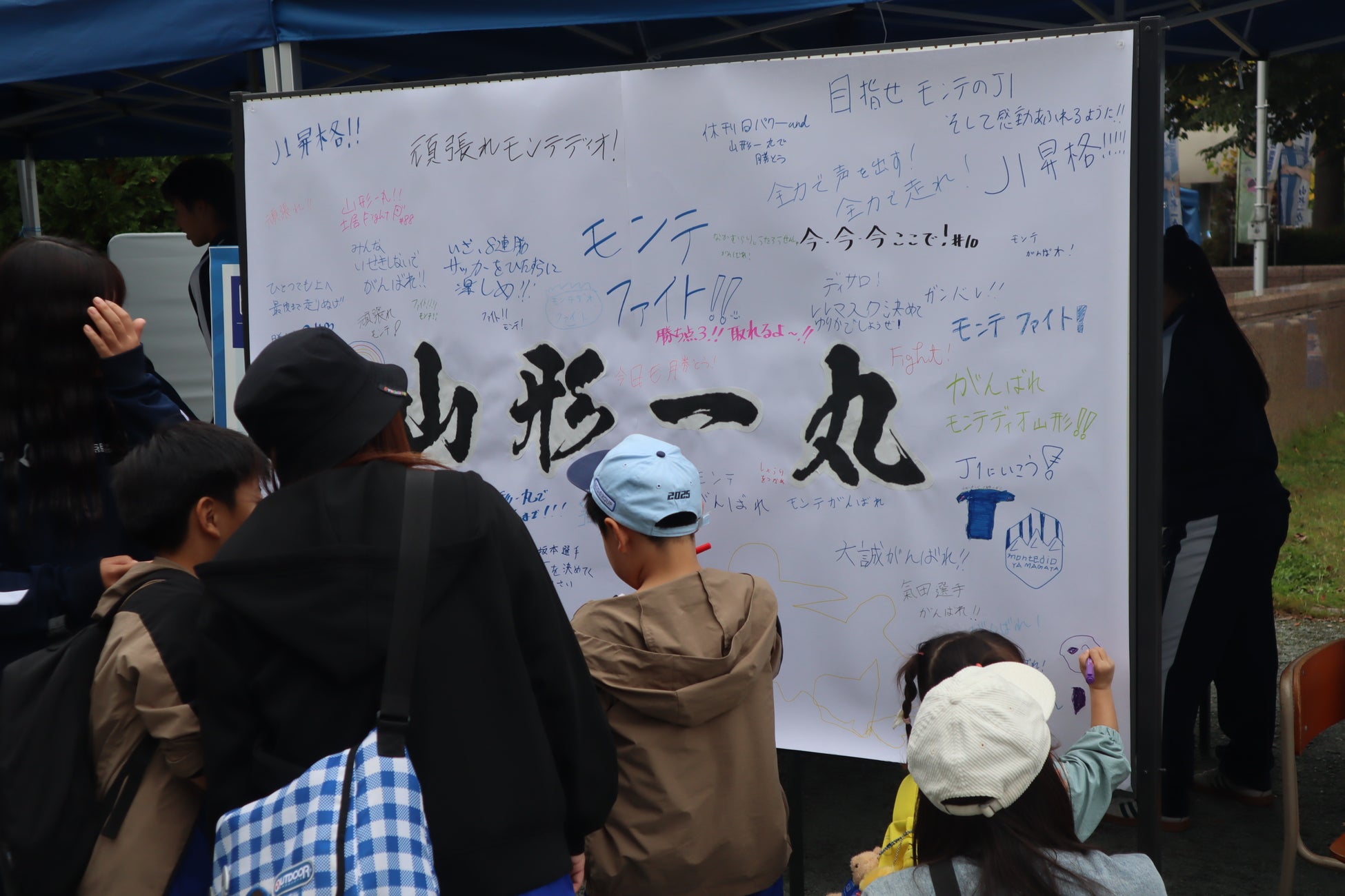 当日は、ファミリー層を中心に150名以上が参加。ロスフラワーから抽出した絵の具を使い、モンテディオ山形のマスコットとユニフォームを題材にしたぬり絵体験を実施しました。完成した作品はその場でラミネート加工を施し、「世界に一つだけのアート作品」として記念に持ち帰っていただきました。また、会場には「山形一丸」のスローガンを掲げた寄せ書きボードを設置し、地域とサポーターの想いをつなぐ象徴的なフォトスポットとして、多くの方が記念撮影を楽しむ姿が見られました。