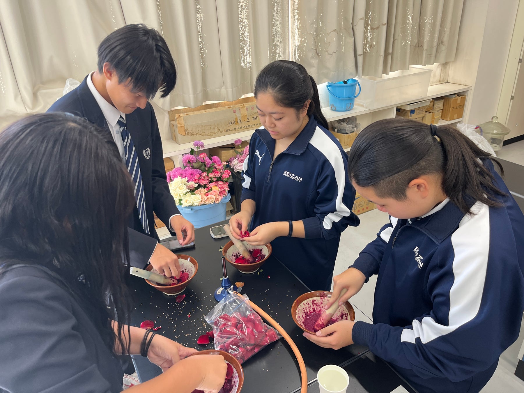 廃棄予定の花の収集から絵の具づくり、イベント当日の運営までを担ったのは、地域と連携したSDGs学習を推進する惺山高等学校の生徒たちです。同校は「社会を学びのフィールドに」を掲げ、環境や地域課題を自らの手で探究する実践型の授業を展開しており、今回の活動もその一環として有志の生徒23名が参加しました。生徒たちは、環境問題を調べる中で花の廃棄量が想像以上に多いことを知り、「農家の方々が丹精込めて育てた花が、使われないまま捨てられている現状を何とかしたい」「ロスによって花屋さんにも負担が生じていることを知り、少しでも再利用につなげたい」との想いから今回の取り組みに参加。イベント当日には、来場者と直接交流しながら、花の命を“次の形”につなぐ循環の大切さを体感。「花が人の笑顔につながる瞬間を見て、自分たちの活動の意味を実感した」「元々フラワーロスについて知らなかったが、知らないことに挑戦する良さを改めて学ぶことができた」といった声も聞かれ、学びと社会貢献が一体となった貴重な経験となりました。