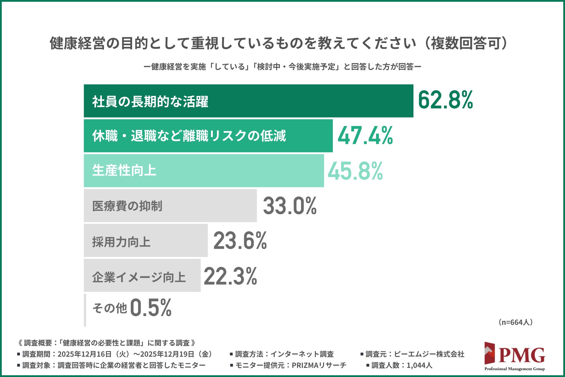 「健康経営を実施する目的」について尋ねたところ、『社員の長期的な活躍(62.8%)』が最多で、『休職・退職など離職リスクの低減(47.4%)』『生産性向上(45.8%)』と続きました。