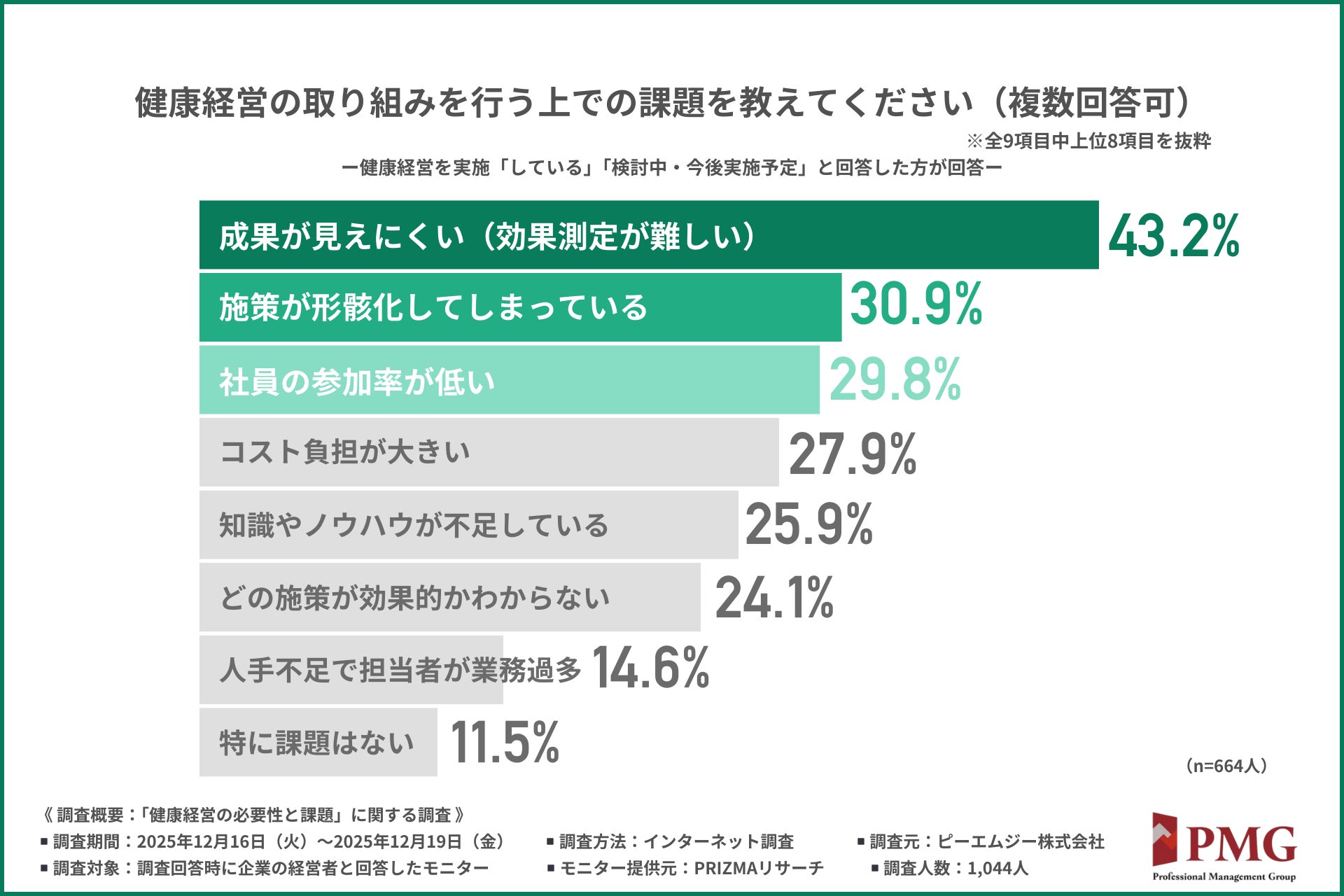 「健康経営を進める上での課題」を尋ねたところ、『成果が見えにくい(効果測定が難しい)(43.2%)』が最も多く、『施策が形骸化してしまっている(30.9%)』『社員の参加率が低い(29.8%)』と続きました。