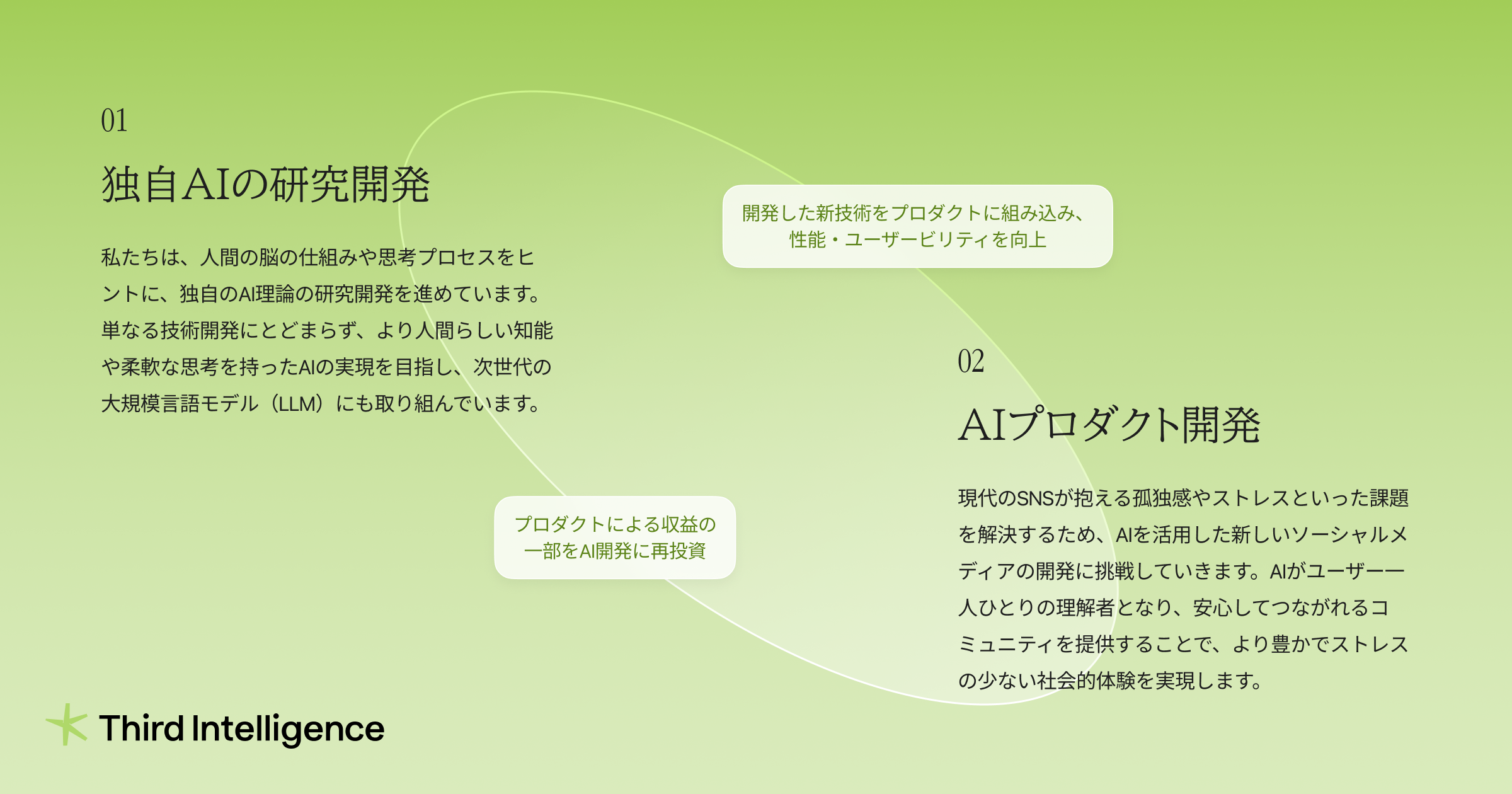 そして、AGIのグローバル競争においては、事業収益をフロンティアモデル開発のGPU・データ・人材に再投資し、進化した技術をプロダクトに反映させることで競争力を強化し、さらなる事業収益を生み出す──という投資サイクルが重要です。Third Intelligenceでは、AGIの確立を基点にこのサイクルを自社で完結できる体制を構築することで、持続的な技術的優位性の確保に取り組んでまいります。