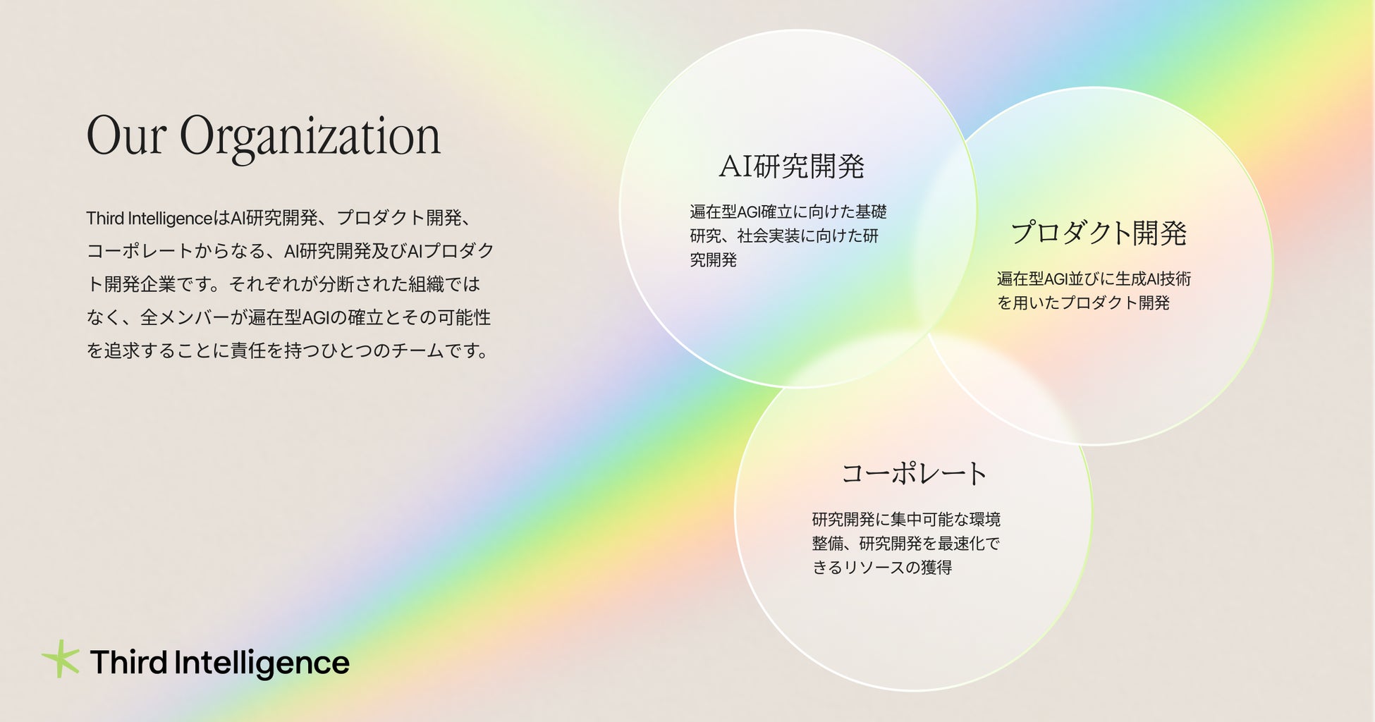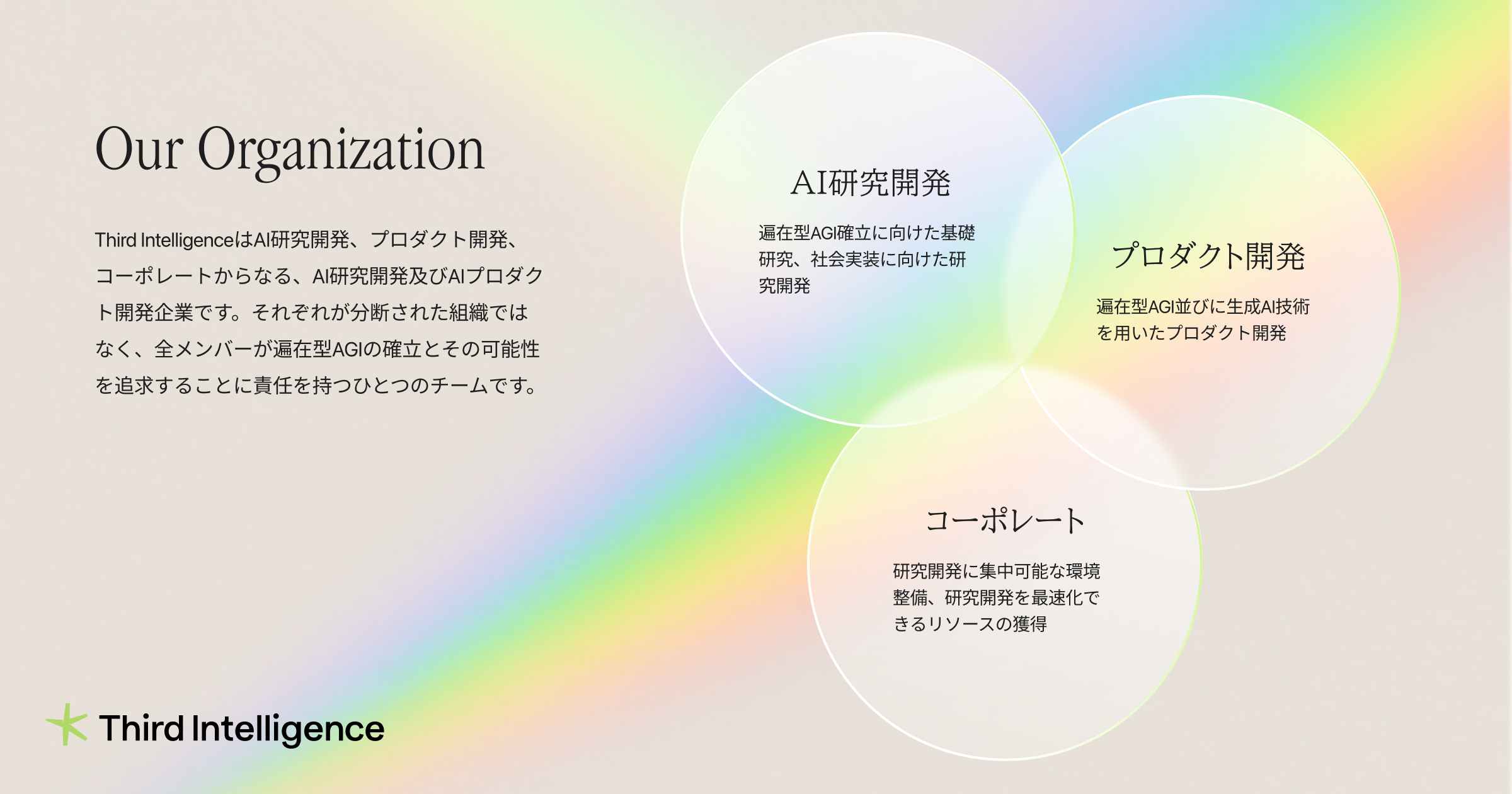 Third Intelligenceは、松尾豊が石橋準也らと共に設立したAI研究・プロダクト開発企業です。「それぞれの場所で独自に成長する『遍在型AGI(汎用人工知能)』を実現し、人間とAIが豊かに共生する世界をつくる。」というミッションのもと、2025年6月より独自AIの開発事業を本格的に開始しています。