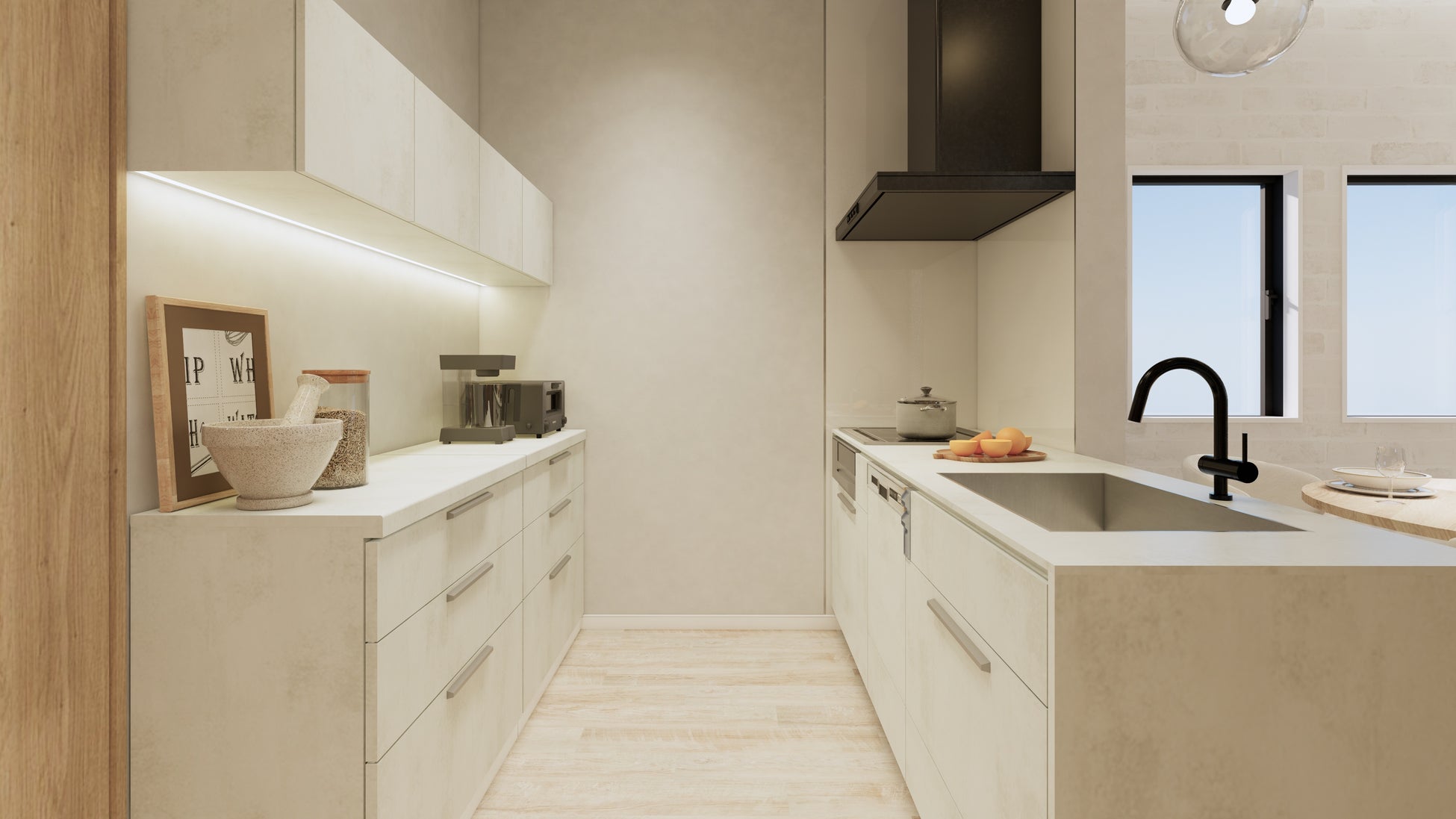 開放感のある天井高3メートル、デザイン性と機能性を兼ね備えたGRAFTEKT社製キッチン、