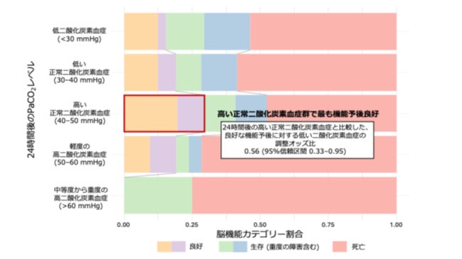 病院外で発症した心停止患者の予後は年々少しずつ改善していますが、未だに良好とは言えません。心停止後は自身の心臓の拍動が再開しても、脳を保護するために集中治療室での全身管理を必要とします。その中でも動脈血二酸化炭素濃度 (PaCO2) は脳血流に強く影響することが知られており、適切な管理が必要とされています。これまでの研究では、PaCO2の正常範囲とされる30-50 mmHgや35-45 mmHgが心停止後の最適な範囲とされてきましたが、ECMO治療*2を受ける患者ではどうなのかということ、正常範囲の中でも低い範囲 (30-40 mmHg) と高い範囲 (40-50 mmHg) で予後に違いがあるのかは不明でした。本研究では日本救急医学会病院外心停止レジストリデータベースを用い、病院外での心停止後にECMO治療を受けた患者において、PaCO2の値とその後の機能的予後との関連を調べました。結果として、ECMO治療開始後24時間のPaCO2は、高い正常二酸化炭素群で最も機能予後が良好であり、低い正常二酸化炭素群と比べても統計学的に差が認められました。心停止後にECMO治療を受けた患者では、高い正常二酸化炭素レベルを維持することが機能予後を改善する可能性が示唆されました。