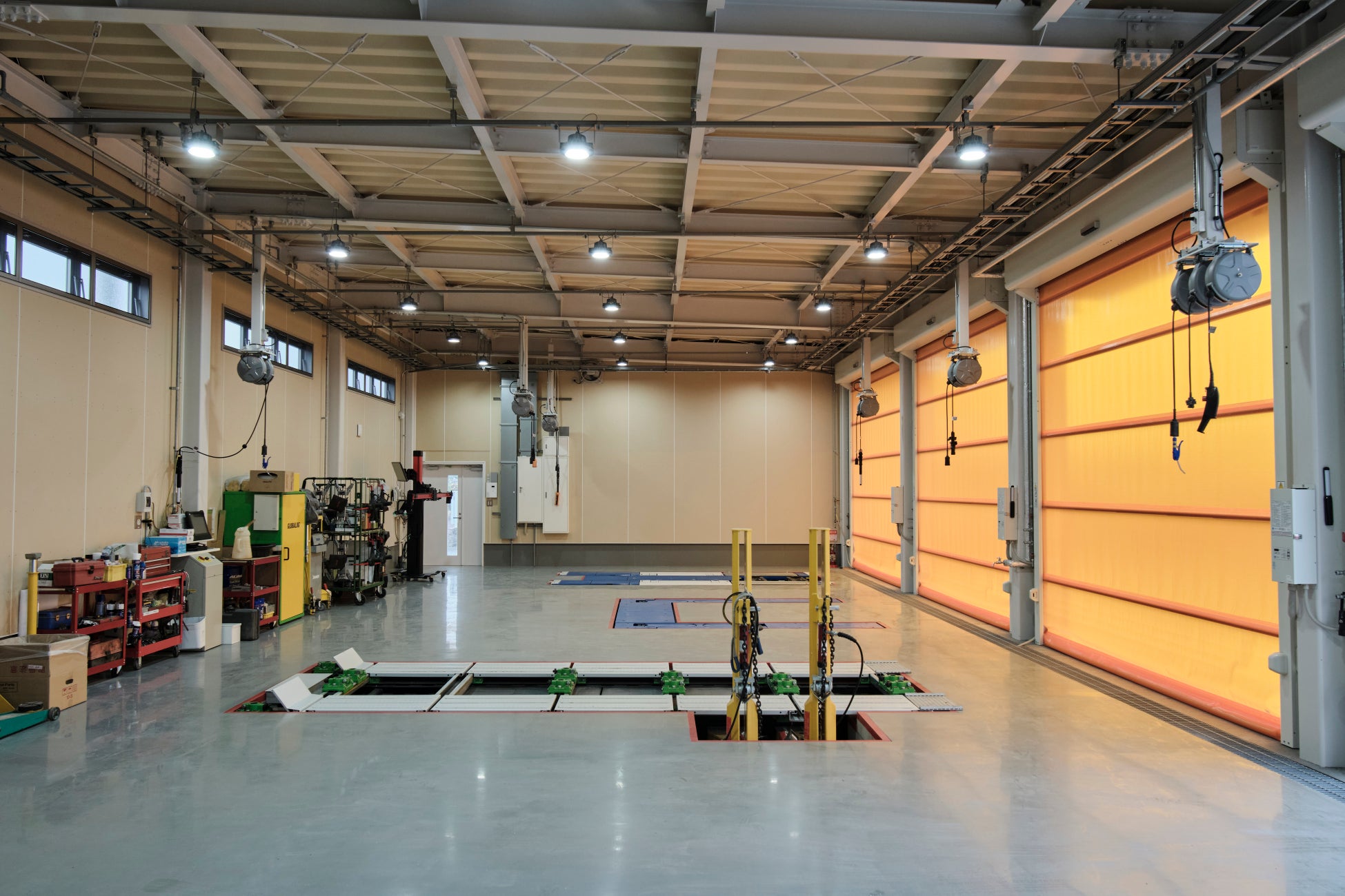 世界最高峰のフレーム修正機や塗装ブースなど、テスラ指定の最新鋭設備を完備。