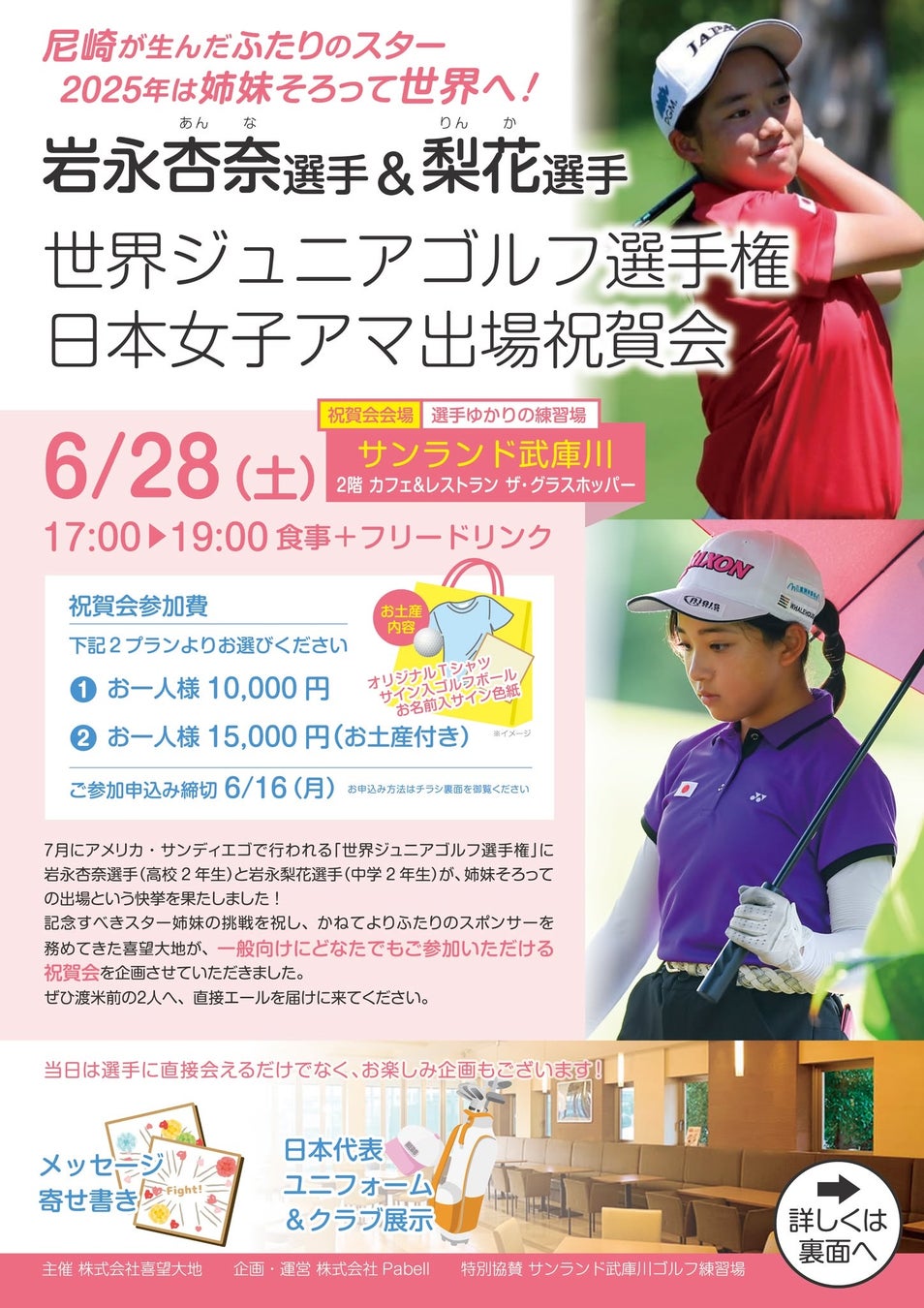 株式会社喜望大地(本社:大阪市北区)は、スポンサーを務めるアマチュアゴルファー岩永杏奈選手・梨花選手の「世界ジュニアゴルフ選手権・日本女子アマ」出場を祝い、渡米前の両選手を激励するイベント「岩永杏奈選手&梨花選手世界ジュニアゴルフ選手権日本女子アマ出場祝賀会」を2025年6月28日(土)に開催します。