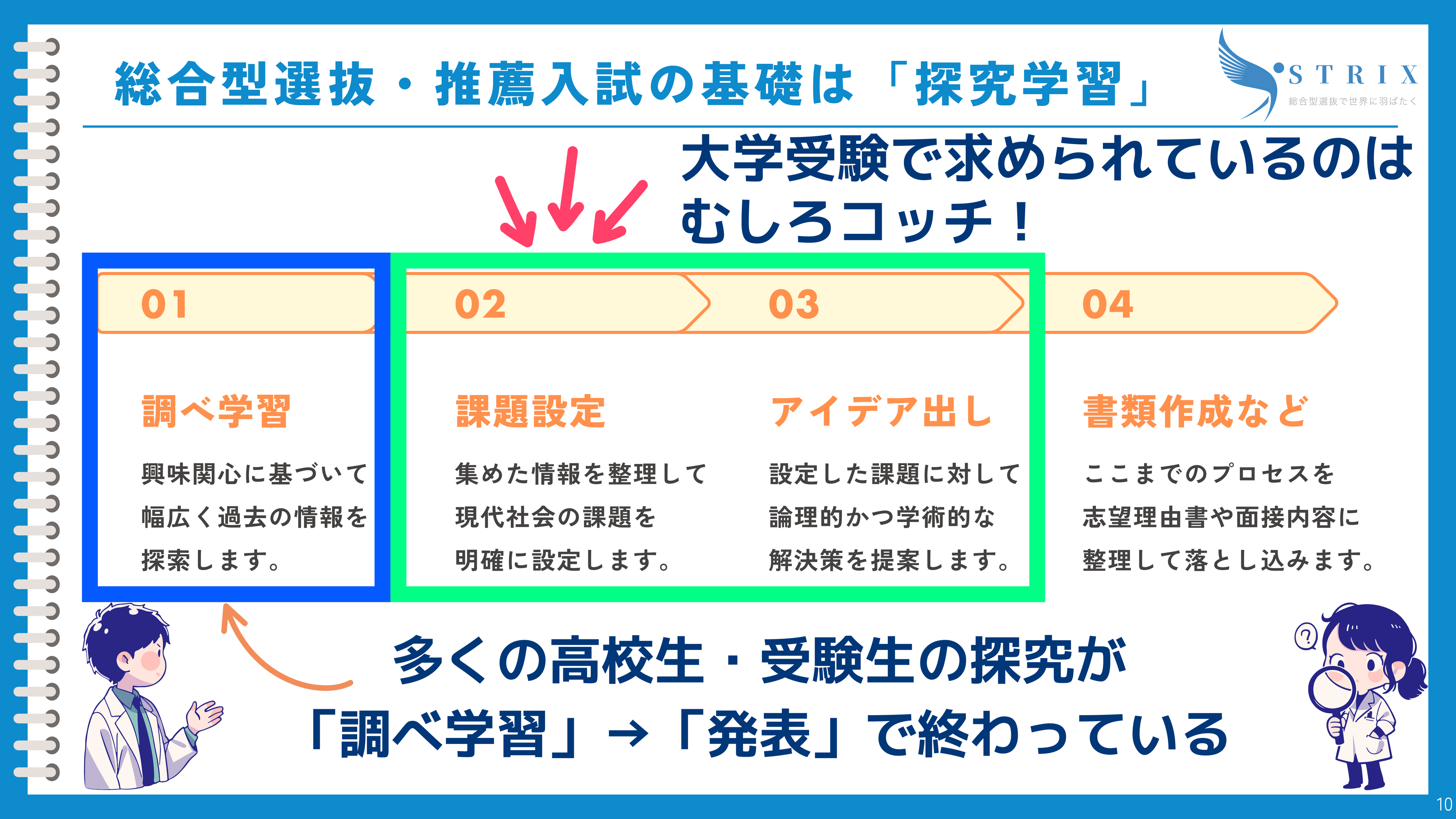 上の図をご覧ください。大学が本当に評価しているのは、「02 課題設定」「03 アイデア出し」の部分です。