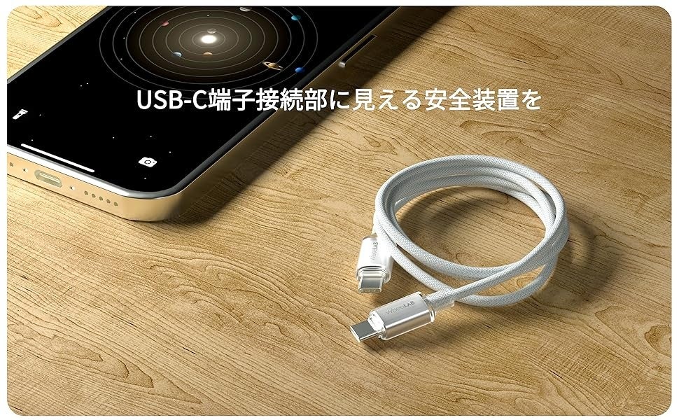 「根元から壊れる」というケーブルあるあるに真っ向から挑んだ、高耐久タイプ。やや長めの1.2mで、ソファーやベッド周りの充電でも取り回し良好です。