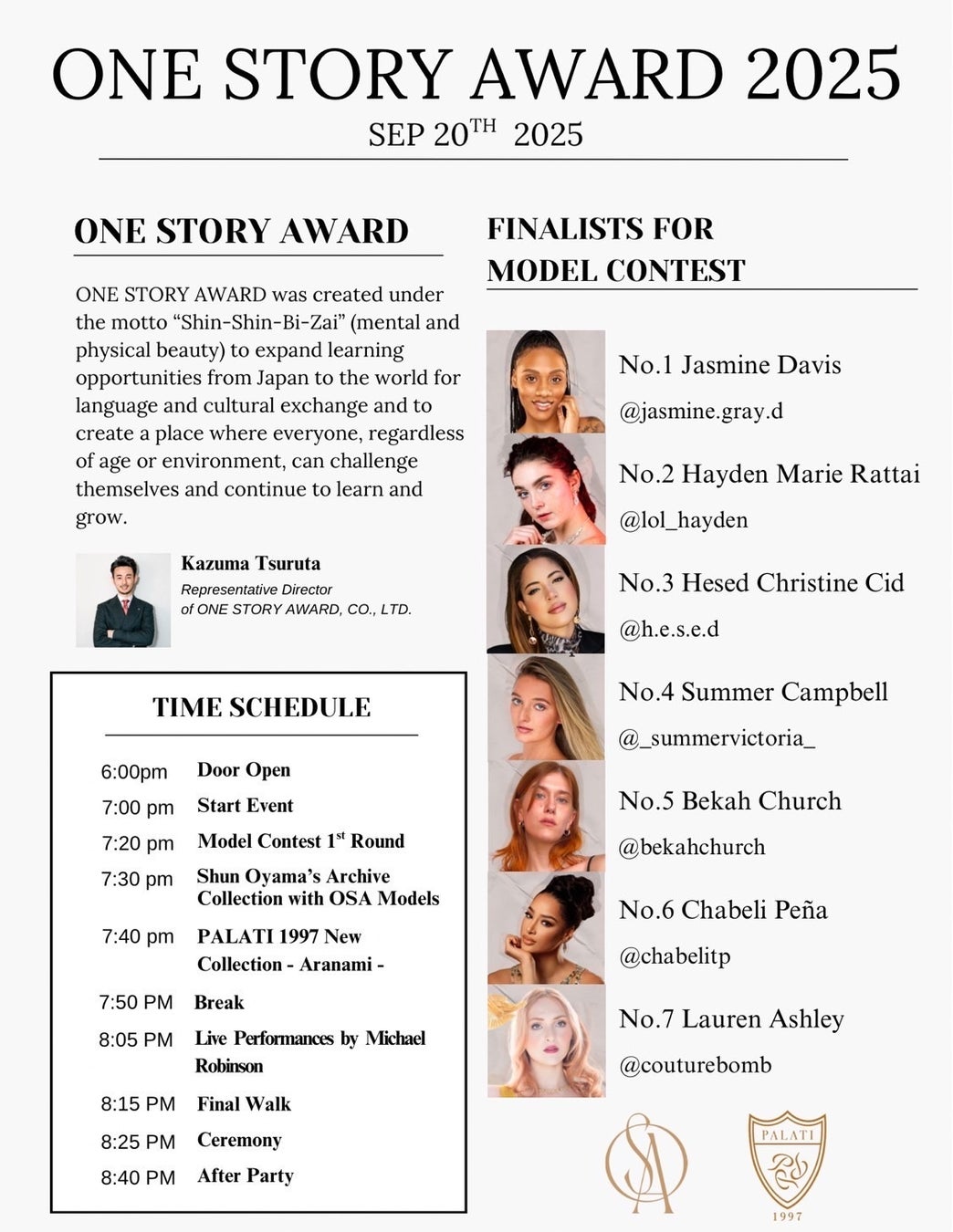 ニューヨークファッションウィークシーズンにあわせて開催された今回のNYアワードでは、以下のプログラムおよび出演者により、国際的な舞台で多様な表現と文化交流が実現しました。また、PALATI 1997 デザイナーShun Oyama(小山 隼)氏のコレクションテーマ「Aranami」による、ONE STORY AWARD出場者とNYプロモデルのコラボレーションファッションショーも開催されました。
