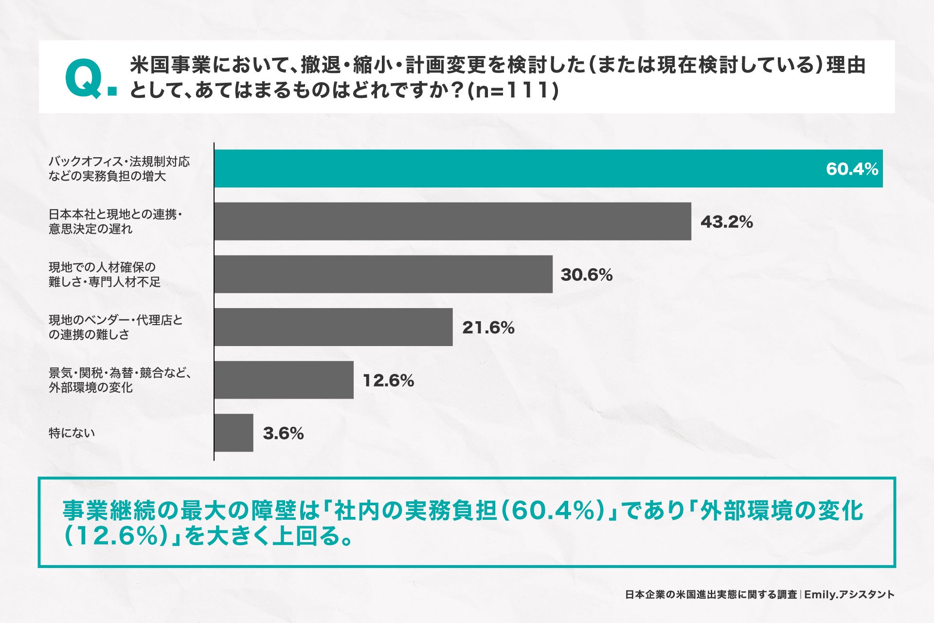 1. 撤退・縮小・計画変更を検討する最大理由は「バックオフィス・法規制対応などの実務負担の増大(60.4%)」、外部環境の変化(12.6%)を大きく上回る