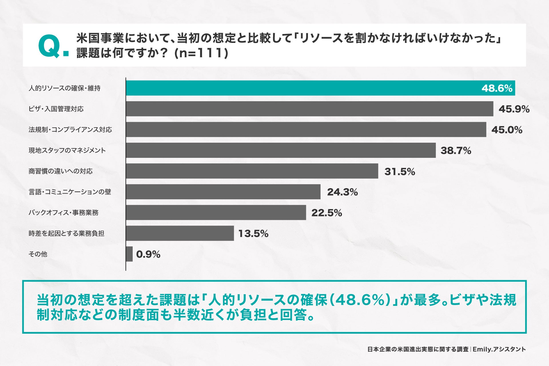 2. 想定外のリソースを要した課題は「人的リソースの確保・維持(48.6%)」が最多、ビザ・法規制対応が上位を占める