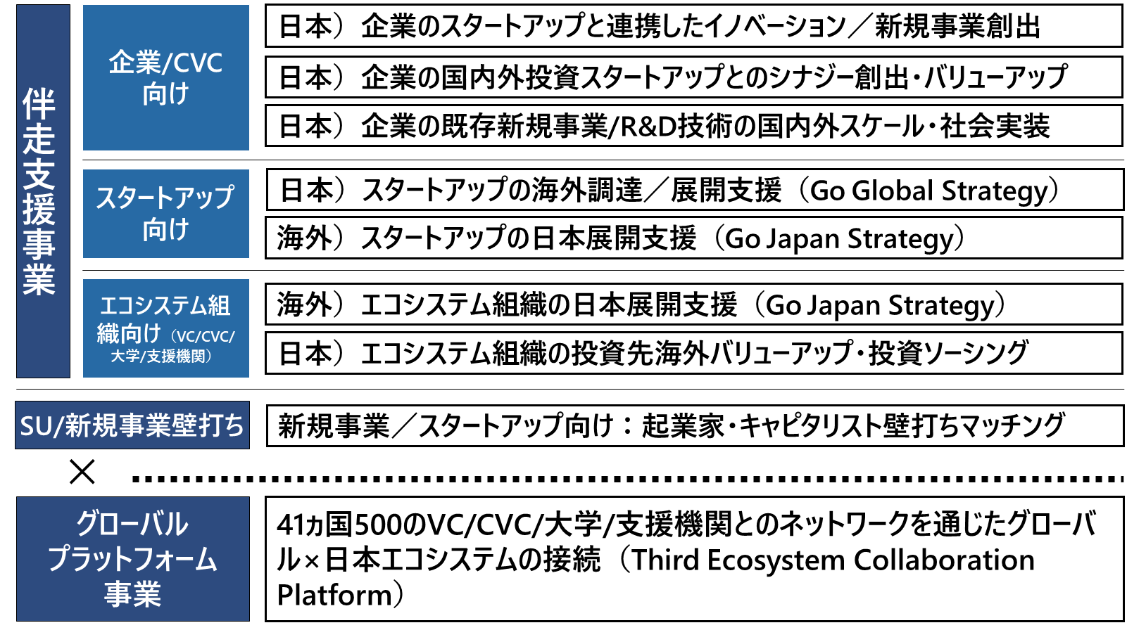 現在、41ヵ国、500以上のグローバルスタートアップエコシステムを構成する企業・組織とのネットワークを有しており、グローバルに活躍するスタートアップやエコシステム企業を生むインフラとなります。各国や領域のスタートアップエコシステムを水平的に接続することによってスタートアップやVC・企業・大学・支援機関等の活動を加速します。各国のスタートアップエコシステムの競争力強化や各プレイヤーのグローバル展開を支援します。