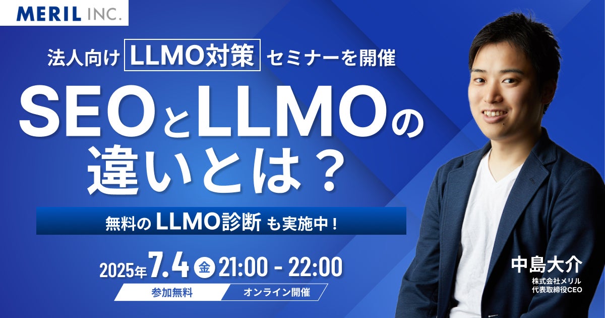 株式会社メリルは、2025年7月4日(金)に法人向けのLLMO対策オンラインセミナー「従来のSEOとLLMOの違い」を開催いたします。