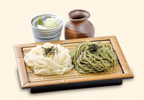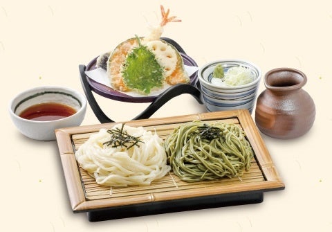 ユーグレナ入りもりそばとうどんの相盛り天ざる