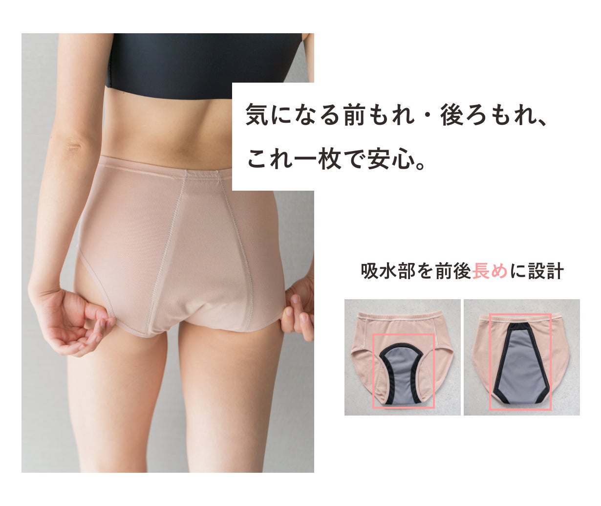 悩む方が多い前もれや後ろもれに対応できるよう、吸水部は前も後ろも長めの設計にしました。