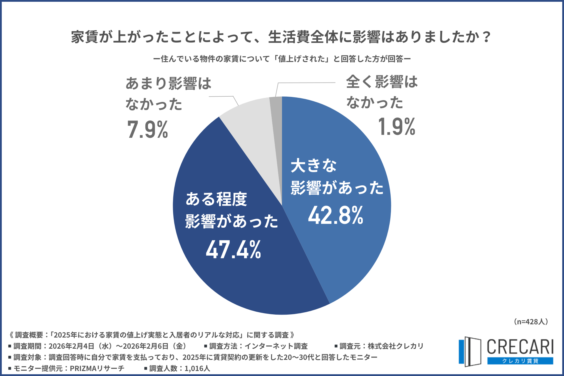 「家賃が上がったことによって、生活費全体に影響はあったか」について尋ねたところ、約9割の方が『大きな影響があった(42.8%)』『ある程度影響があった(47.4%)』と回答しました。
