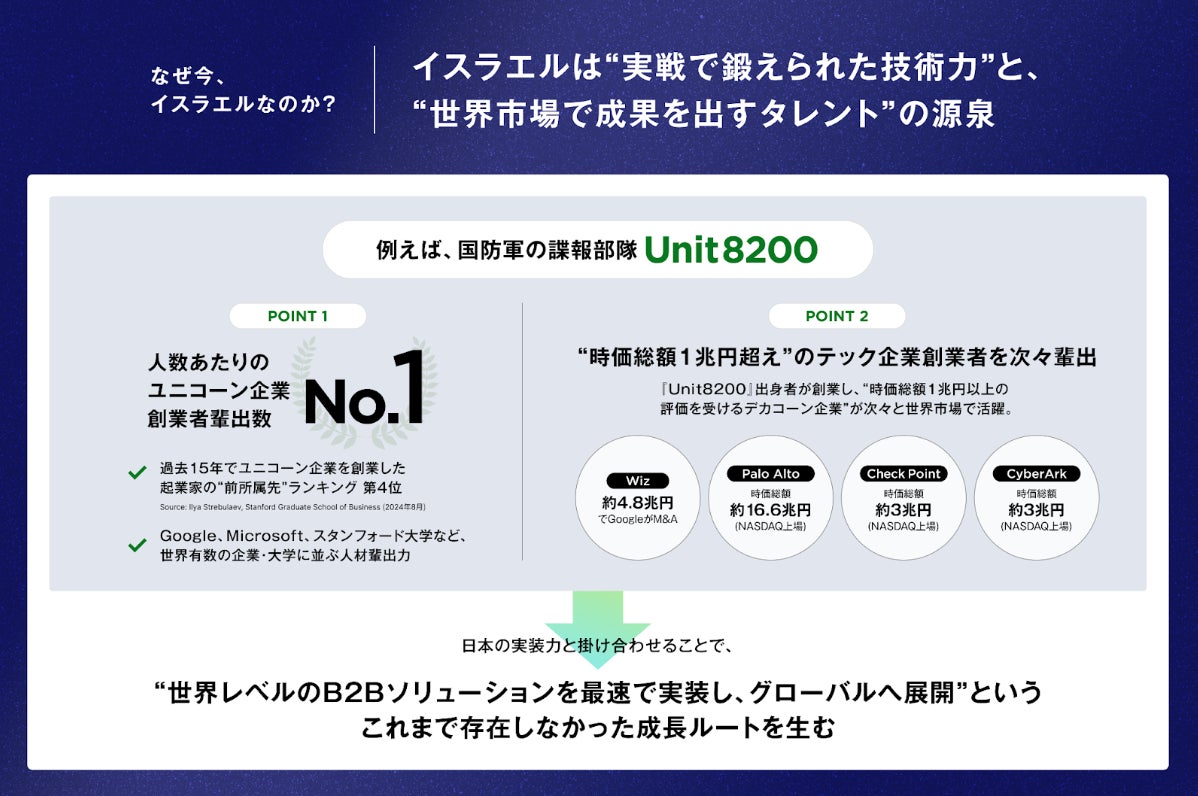 また、日本の製造業・金融・インフラ産業を中心とするB2B市場を技術実装の場として活用し、イスラエル発の革新的技術が米国およびグローバル市場へ拡大する過程に日本企業を組み込むことを目指しています。