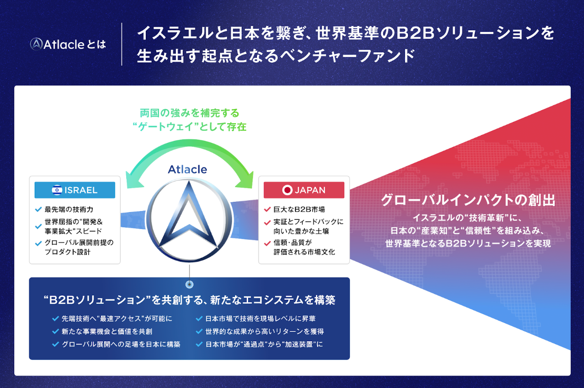 そこにAtlacleが日本へのゲートウェイとして存在することで、イスラエルから米国及びグローバル市場への飛躍を遂げる中に日本を繋ぐ起点を作り、BtoB大国である日本が最先端の技術やサービスにアクセスし、かつ有望スタートアップへの投資機会を日本国内に提供します。